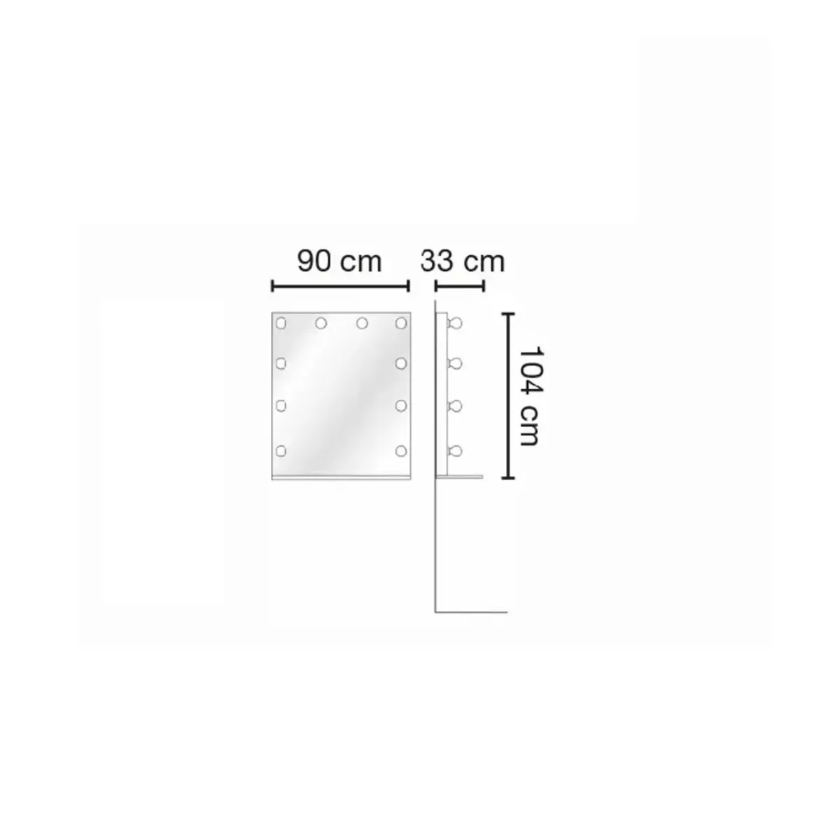 Struttura in nobilitato legno bianco con specchio incollato e sistema di illuminazione con 10 fari.