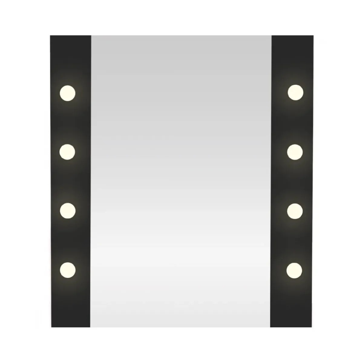 Specchiera trucco con predisposizione di 8 luci per make up artist. Dimensioni: 90x80x8 cm. Dimensioni specchio: 90x56 cm.