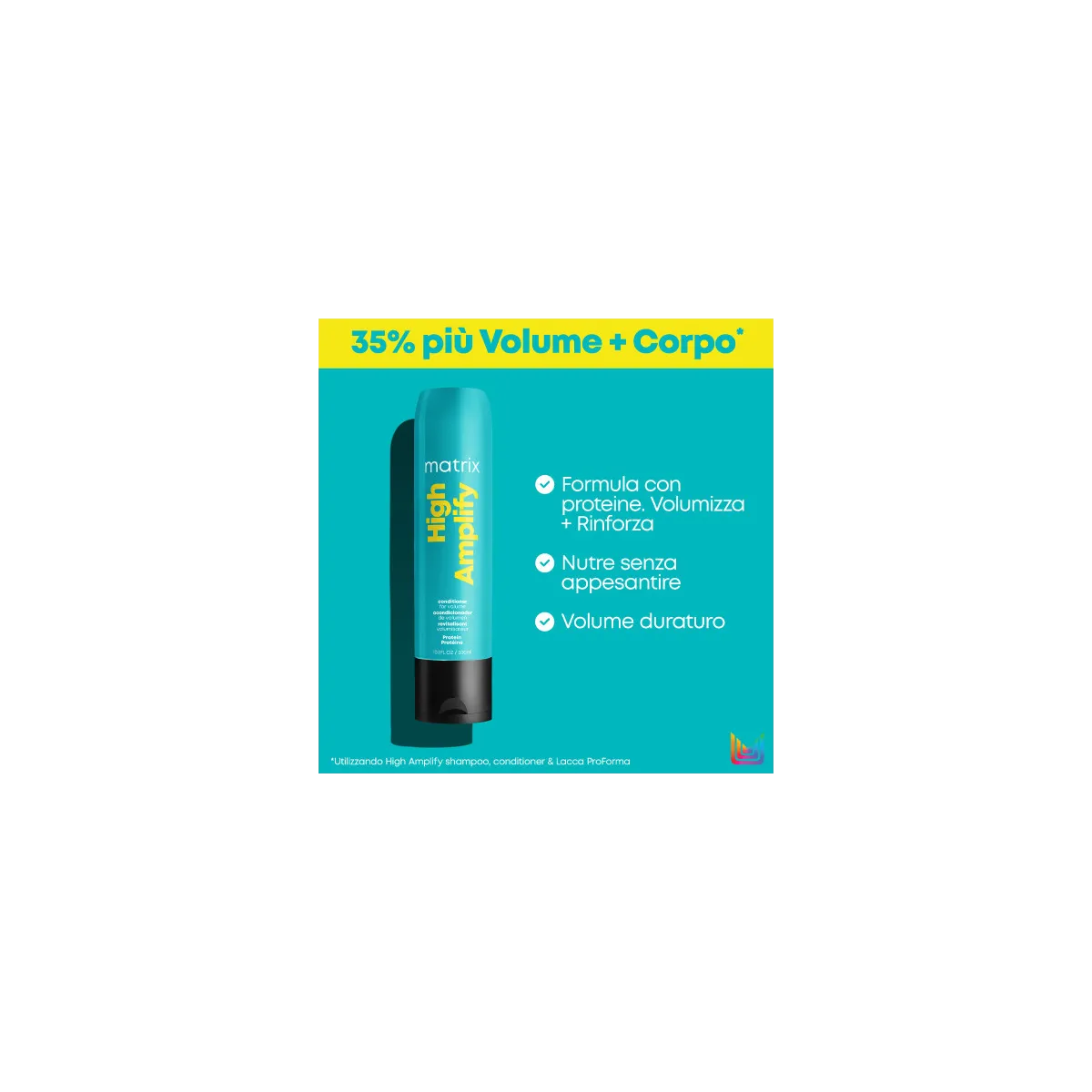 Matrix Conditioner High Amplify dalla formula professionale con proteine che aiuta a sostenere la struttura dei capelli fini e sfibrati, per un volume duraturo.