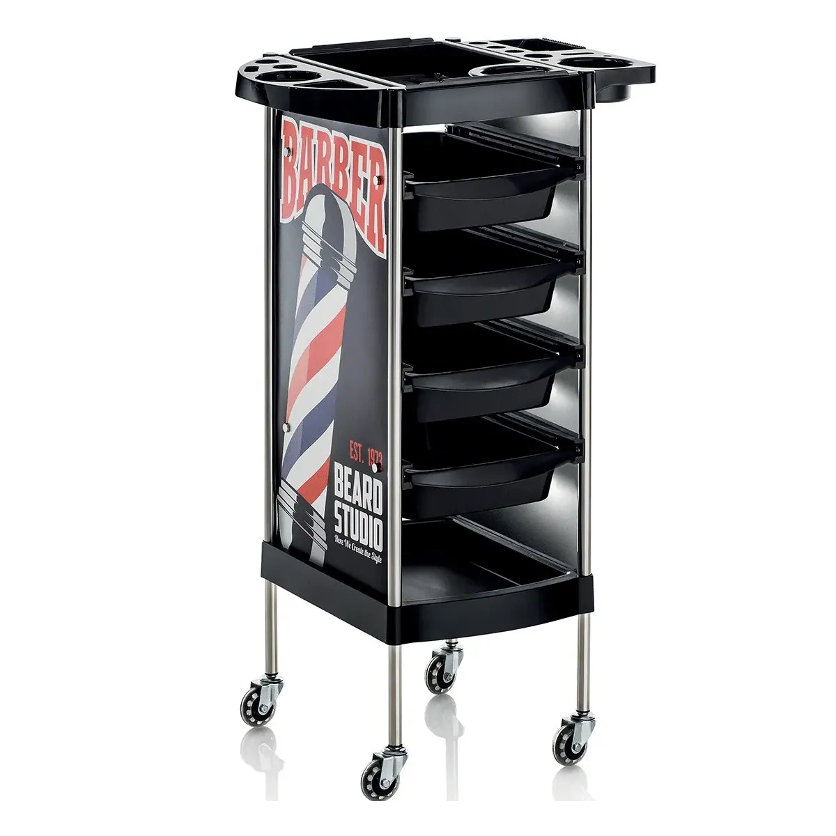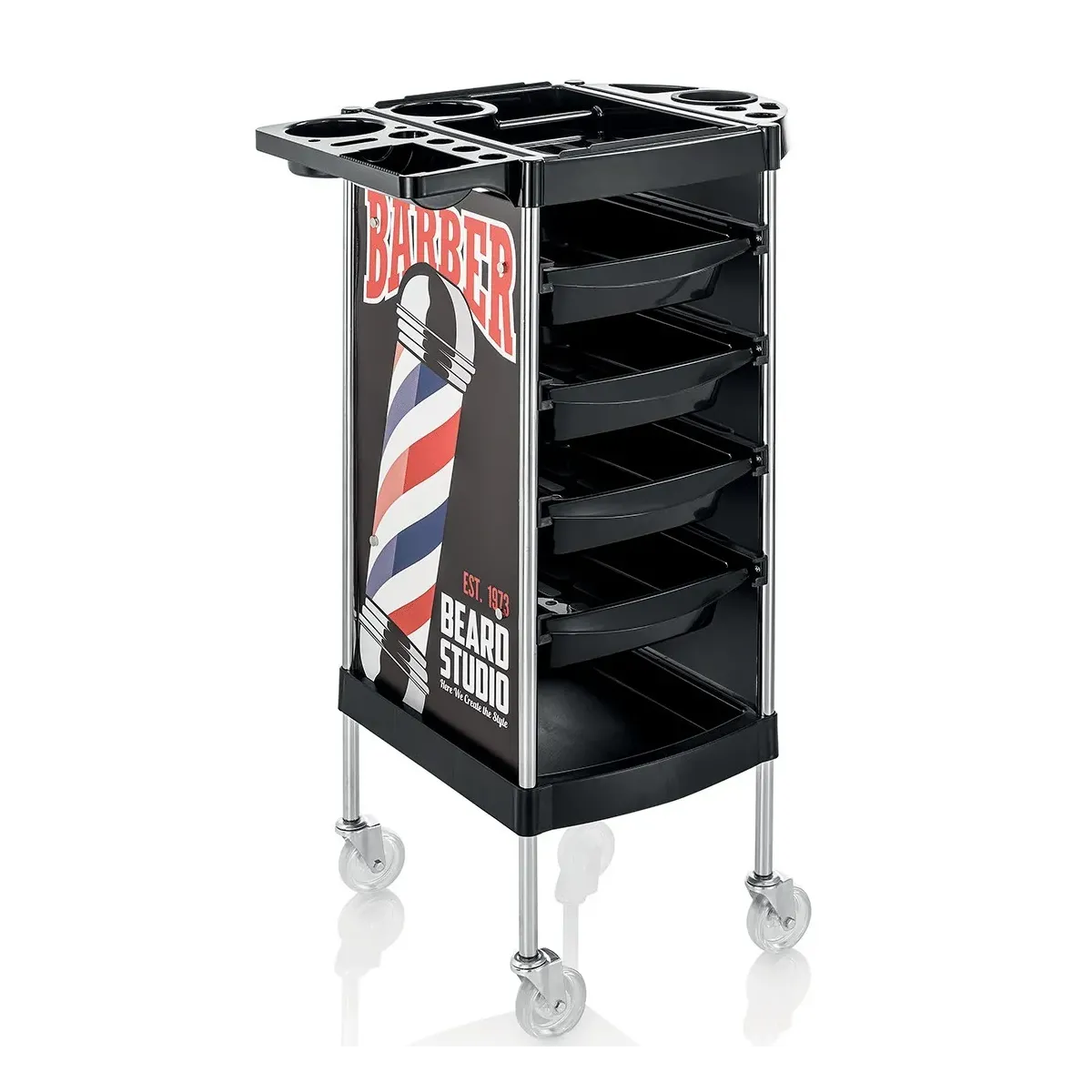 Il corpo si presenta molto ampio, ideale per un'organizzazione personalizzata degli strumenti e sono inclusi 4 cassetti estraibili. Ai lati del carrello sono presenti delle grafiche molto accattivanti che si sposeranno benissimo con il tuo negozio da barbiere.
