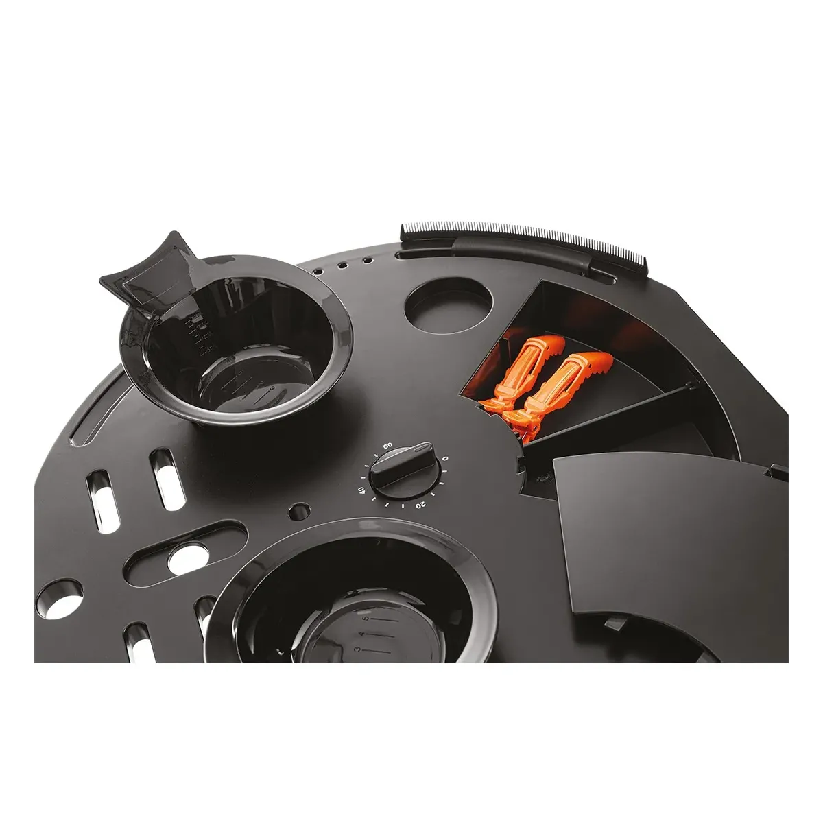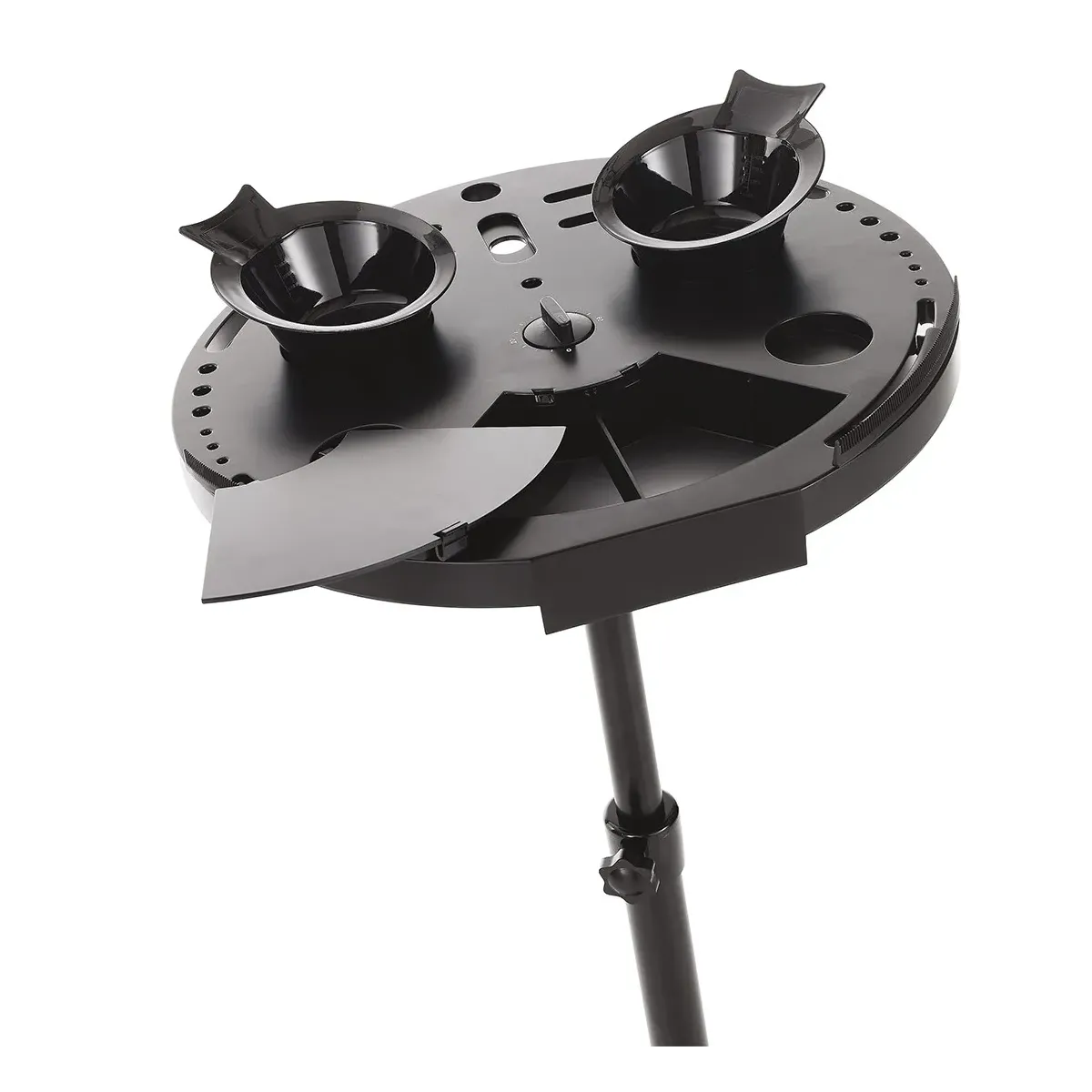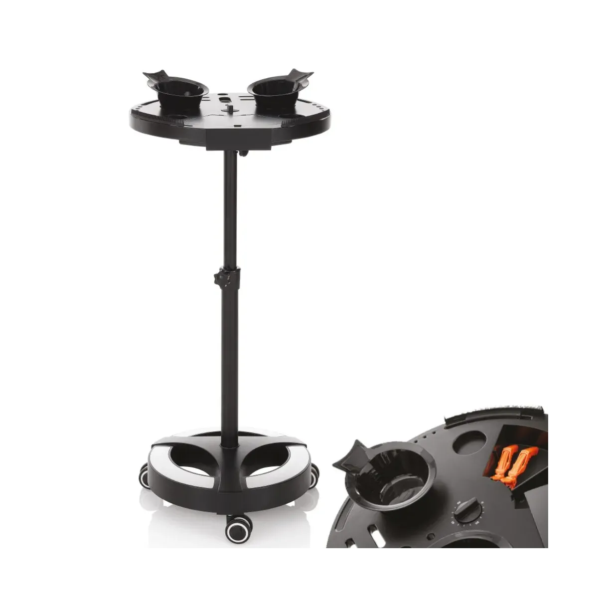 Proponiamo un Carrello per Tinte Capelli strutturato con una solida base dotata di innovative rotelle in gomma anti capelli, uno stativo in acciaio regolabile in altezza con rotella di bloccaggio ed infine un piano tondo super accessoriato con scomparti richiudibili a scorrimento, fori per tenere i pennelli, scodelle per tintura e 2 innovativi pettini per distendere le extension per capelli.