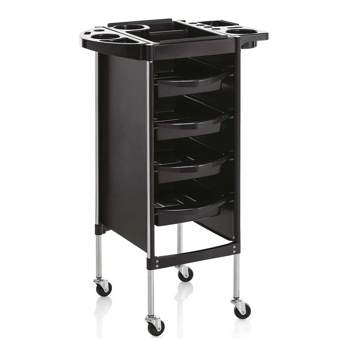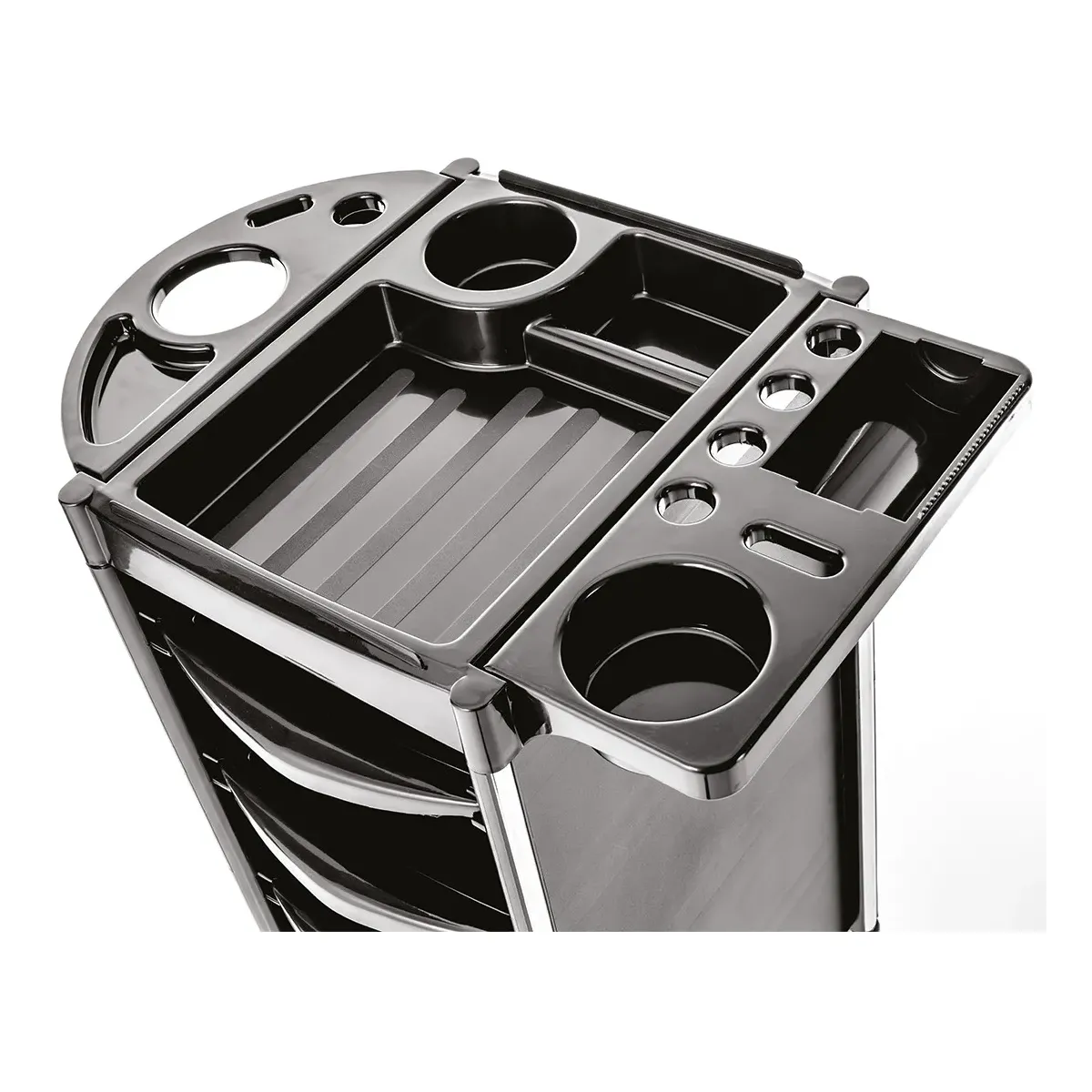 Carrello per Parrucchieri con struttura in acciaio e PVC con riverniciatura nera. E' dotato di un piano super accessoriato per ogni tipo di esigenza in salone, è provvisto di porta carta stagnola, porta phon, scomparti per scodelle e fori per pennelli e spazzole per capelli. Risulta molto pratico e leggero anche grazie alle comode rotelle girevoli che ne facilitano il trasporto, inoltre il montaggio è semplicissimo e non richiede molto tempo.