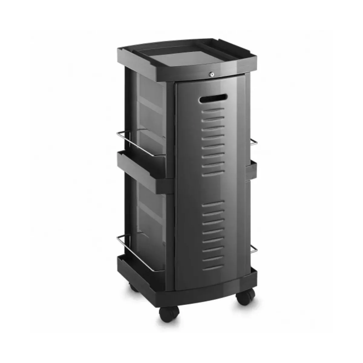 Il Carrello da Parrucchiere Master Clock è l'ideale quando c'è una condivisione degli spazi tra più postazioni da lavoro. E' dotato di un pratico pannello con serratura a chiave che permette di chiudere in modo sicuro all'interno del carrello gli attrezzi personali, senza correre rischi. All'apertura, la porta con serratura si aggancia sul retro del carrello in modo da non causare ingombri di alcun genere. Per tale ragione è un carrello adatto al coworking. Dispone anche di 6 cassetti, agganciabili al piano superiore, e 4 tasche laterali per inserire prodotti e flaconi.