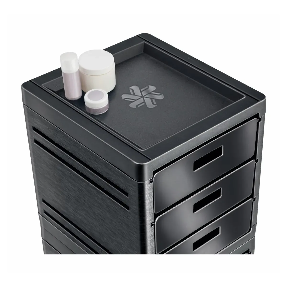 Carrello Parrucchiere Professionale a colonna fatto in polipropilene antimacchia con possibilità di scelta del colore della struttura e dei rispettivi cassetti. Il piano è ampio, liscio e bordato, è provvisto di 6 cassetti estraibili e lateralmente presenta degli attacchi per per agganciare dei porta phon, molto utili anche per piastre capelli, asciugamani e altro. La base è provvista infine di comodissime rotelle con sistema anti-capelli per facilitarne il trasporto senza che i capelli intralcino gli spostamenti.