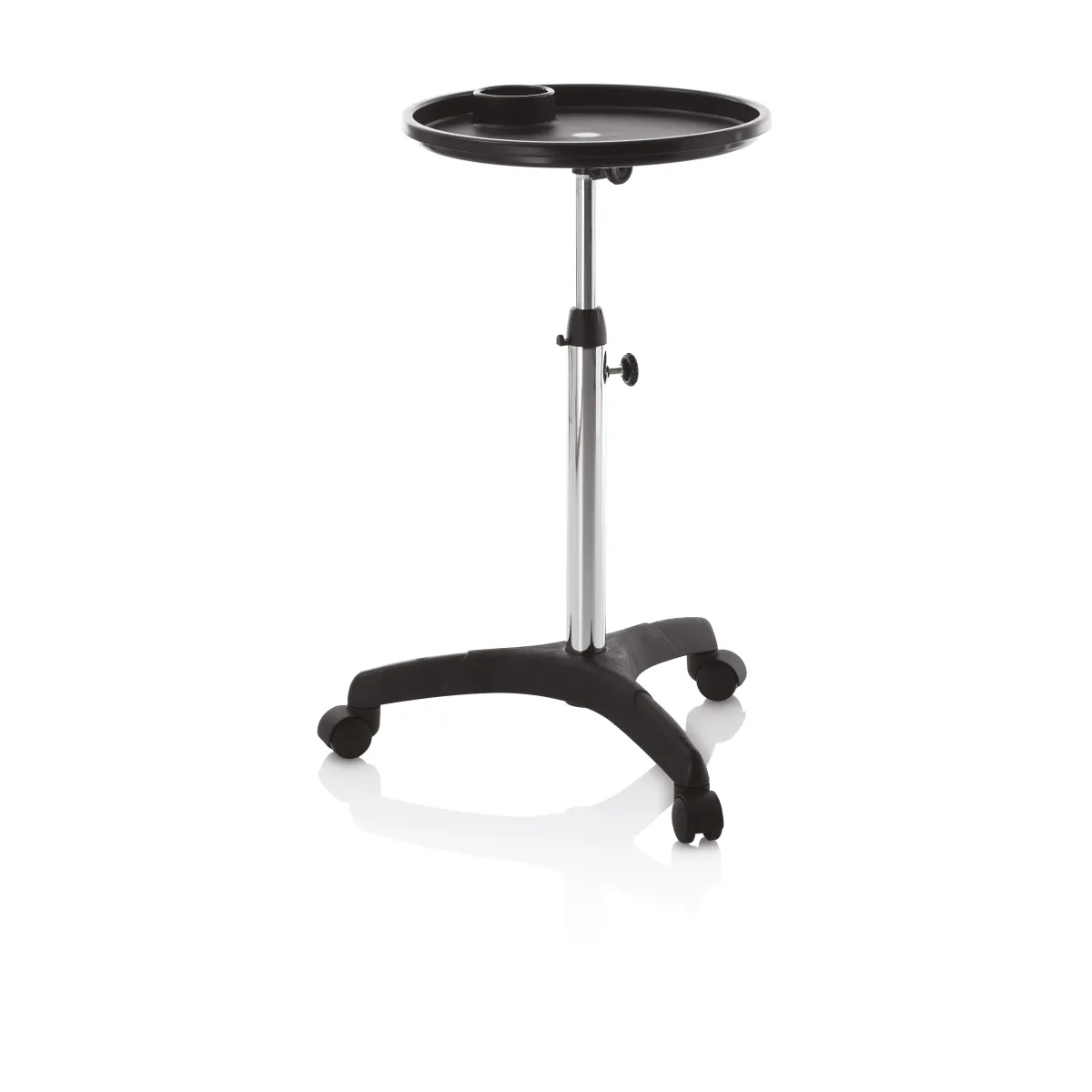 Realizzato in acciaio resistente, lo stativo è regolabile in altezza da 60 cm a un massimo di 89 cm, garantendo così una perfetta adattabilità alle diverse esigenze operative. La base a tre razze con ruote piroettanti offre una grande stabilità e facilità di movimento, rendendolo ideale anche negli spazi più dinamici.