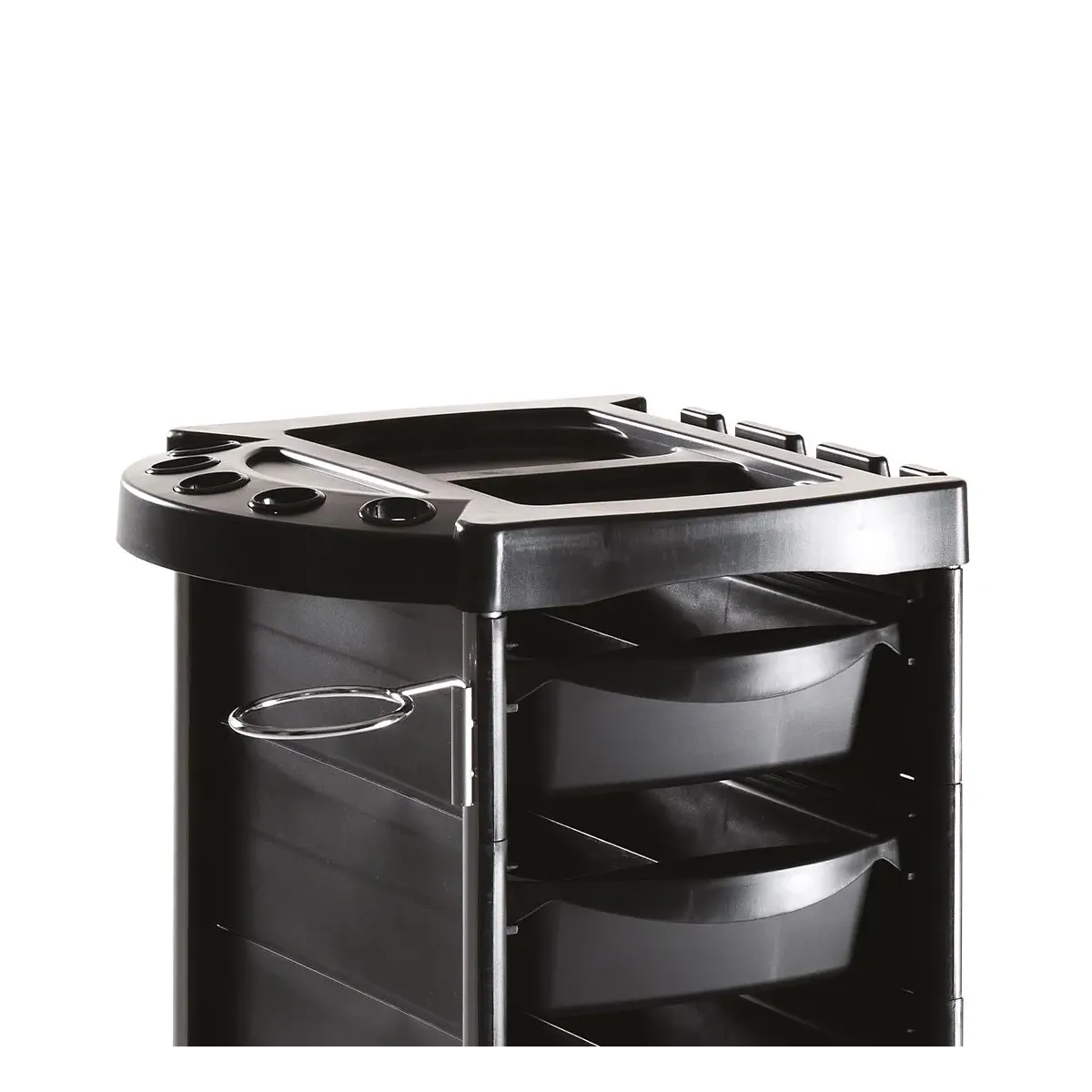 Carrello per Parrucchieri strutturato in acciaio e PVC con verniciatura nera che arreda i saloni con semplicità ed eleganza adattandosi perfettamente ad ogni tendenza d’arredamento.