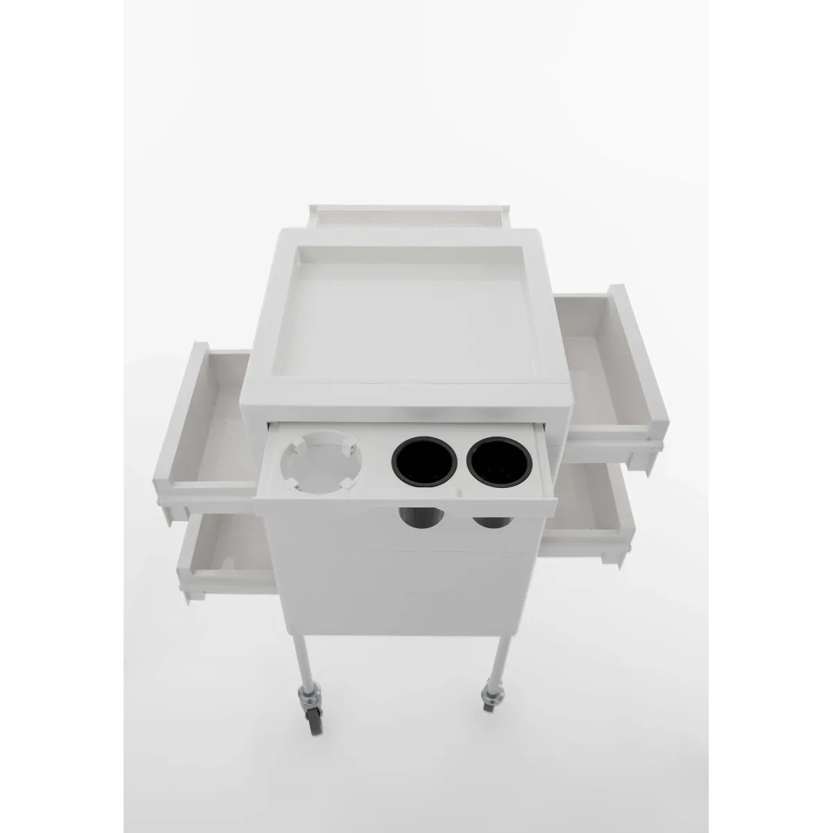 Carrelli per Parrucchieri realizzati con struttura in PVC con colori a scelta tra bianco e nero, ripiano liscio bordato con mensole estraibili lateralmente con un semplice gesto, dove sono presenti scomparti con porta phon, porta pennelli, spazzole, forbici e altro. I 4 cassetti sono estraibili ambo i lati e molto scorrevoli, infine sono presenti delle ruote in gomma per un facile spostamento e lavorare in assoluta comodità.
