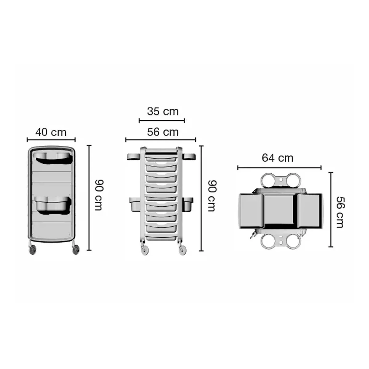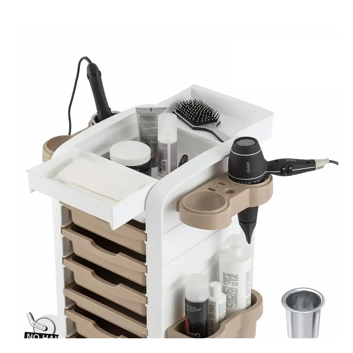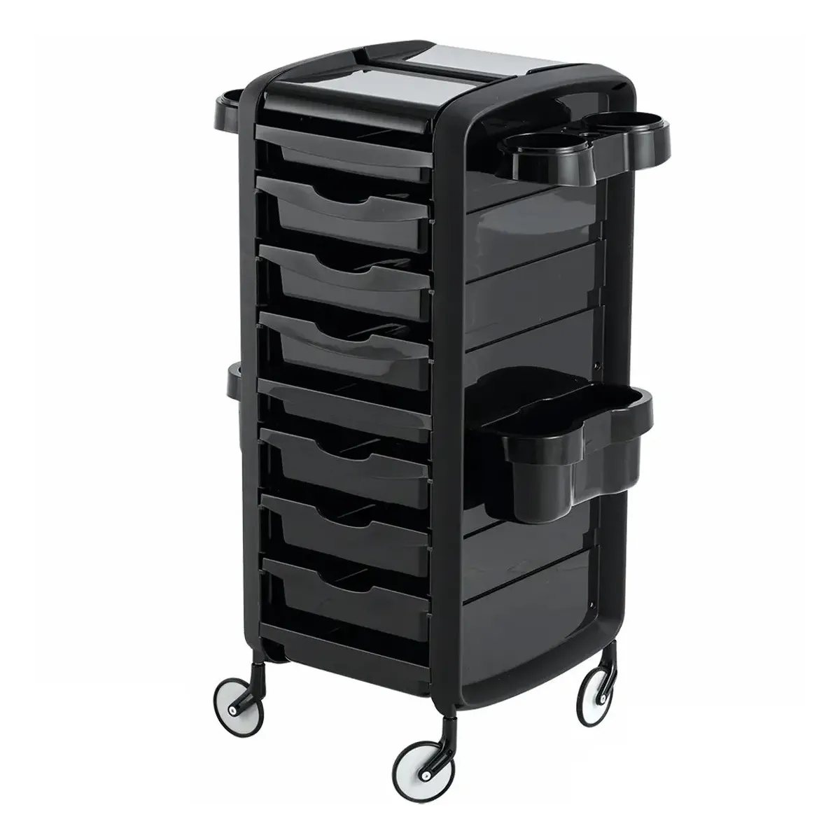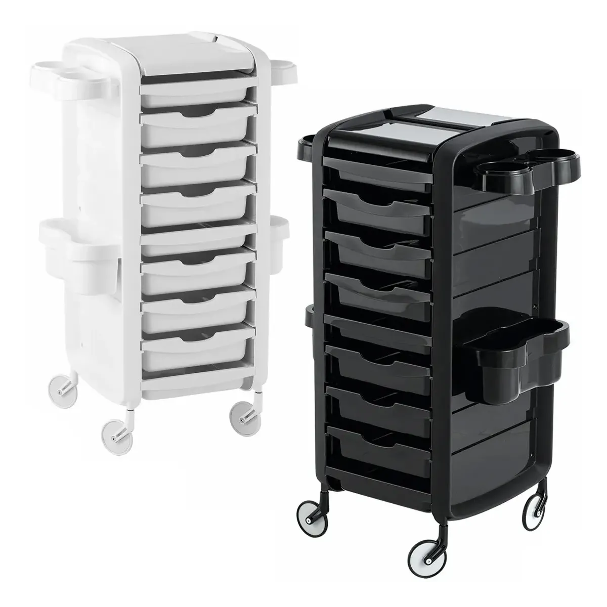 Carrello per Parrucchieri Ceriotti con struttura in polipropilene antimacchia con colori a scelta tra nero e bianco. Piano di lavoro funzionale con sportelli apribili e supporti laterali removibili e posizionabili per alloggiare bombole, flaconi, phon e piastre. E' provvisto di 6 cassetti estraibili ed agganciabili ai lati del piano per ampliarlo. Infine è dotato di ruote anti-capello per un sistema di facile trasporto in modo da non far incastrare i peli negli spostamenti.