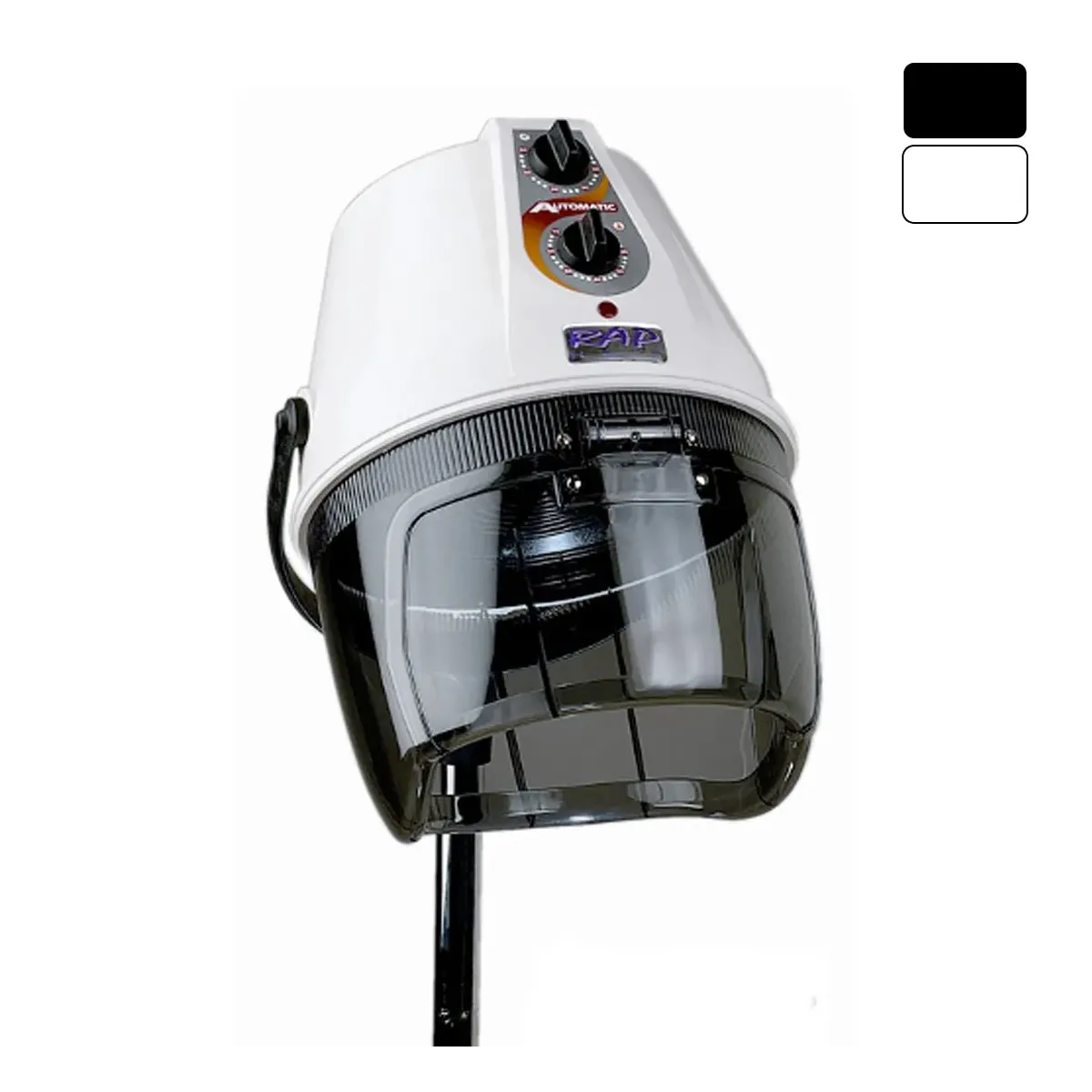 Casco Professionale per parrucchieri Made in Italy prodotto da una nota Azienda che è la RAP HAIR. Questo casco è di colore bianco proprio come illustato nella foto in alto, con carrello stativo dotato di 5 ruote per un facile trasporto e altezza regolabile e 1 manipolo di funzionamento (temperatura e timer).Inoltre raggiunge una potenza di 1165 Watt effettivi.