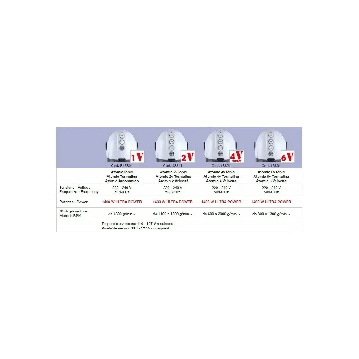 Casco Parrucchiere Ceriotti, azienda leader nella produzione di attrezzature professionali per parrucchieri da oltre 40'anni propone Atomic, un casco dal design elegante con possibilità di sceglierlo in due colori: bianco o nero. È un'elemento che ha bisogno di zero manutenzione siccome il motore è 100% italiano ed è stato progettato con severi standard certificati. Esso è in grado di resistere a temperature tropicali e raggiunge elevate velocità ricavante in cava e con condensatore, ha un basso carico specifico, non propaga fiamma ed ha un'alta resa di riscaldamento grazie alla sua ultra potenza di 1400 Watt. Sulla campana troviamo alcune funzioni come ad esempio il temporizzatore, il termostato, la spia di controllo della temperatura e il selettore di velocità delle ventole a 4 velocità. Il prodotto verrà fornito in scatola Ceriotti con marchio e provenienza Italiana Certificata.