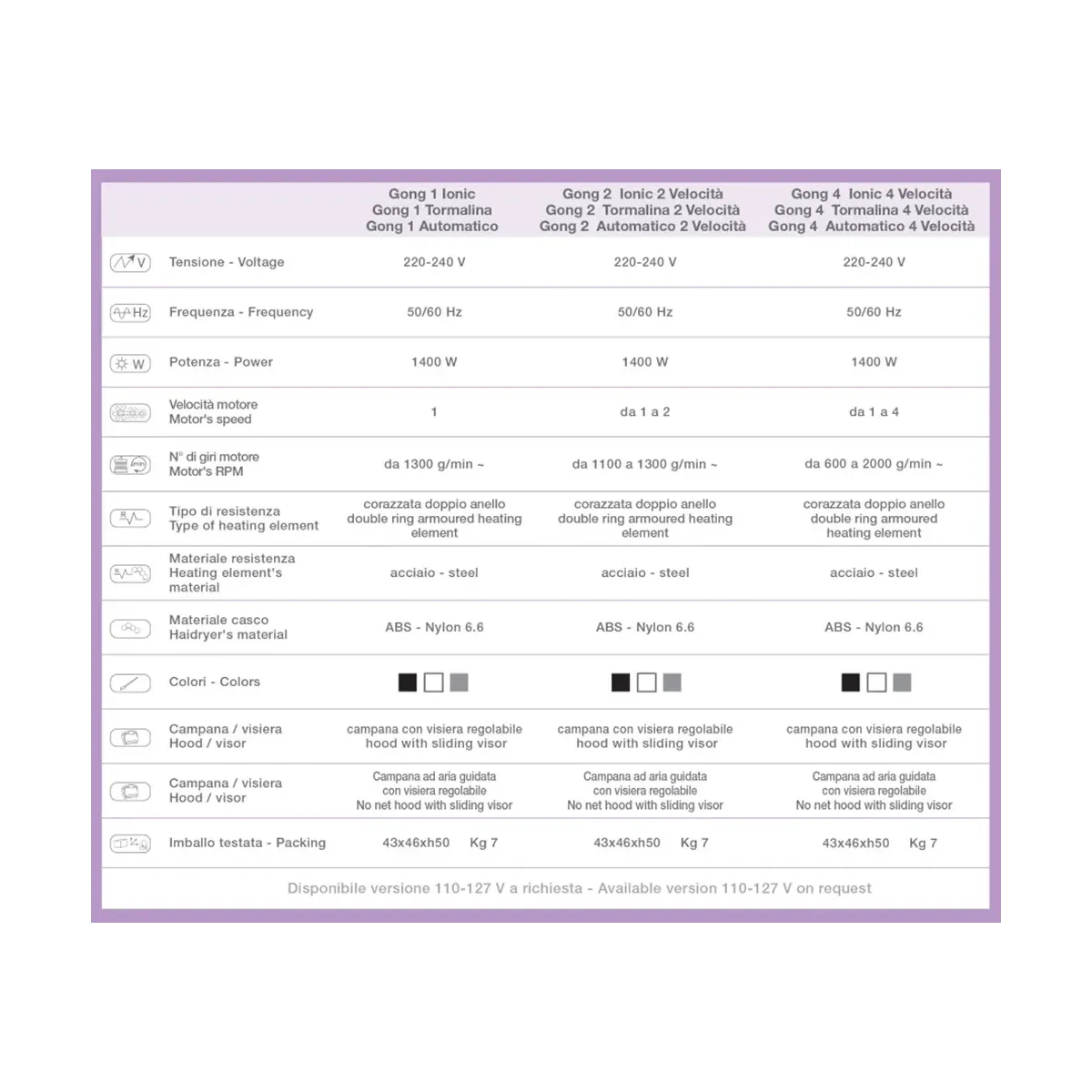 - Voltaggio: 220-240 V - 50/60 Hz
