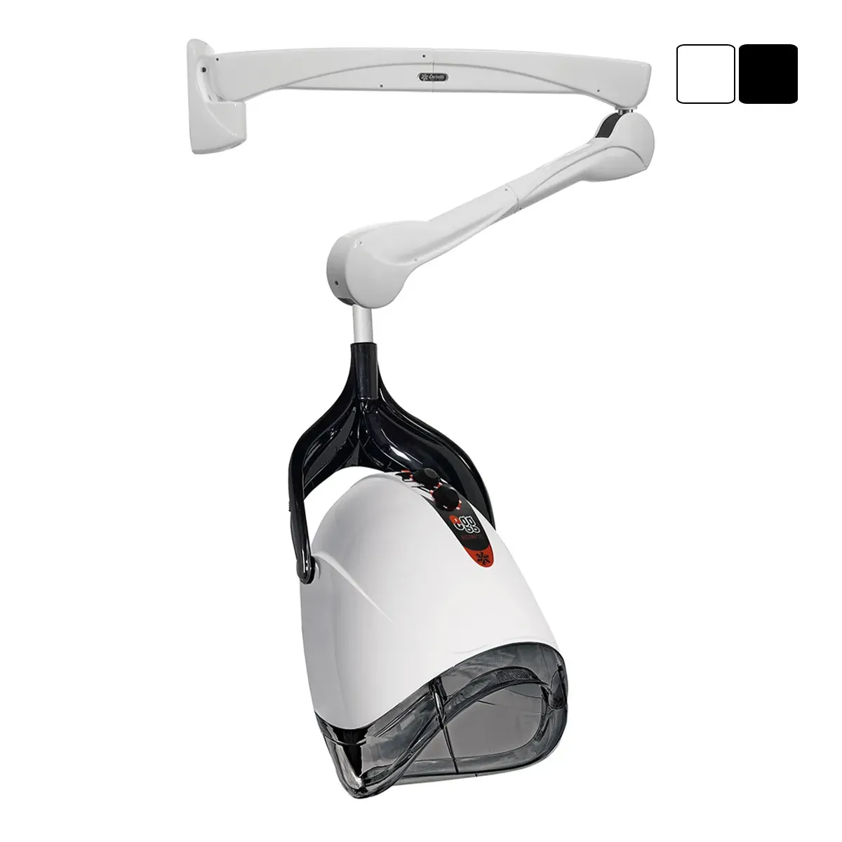 Il vero punto di forza è il braccio a muro snodabile, che permette di liberare completamente il pavimento da ingombri, ideale per saloni ordinati e organizzati. La campana trasparente agevola il monitoraggio durante il trattamento.