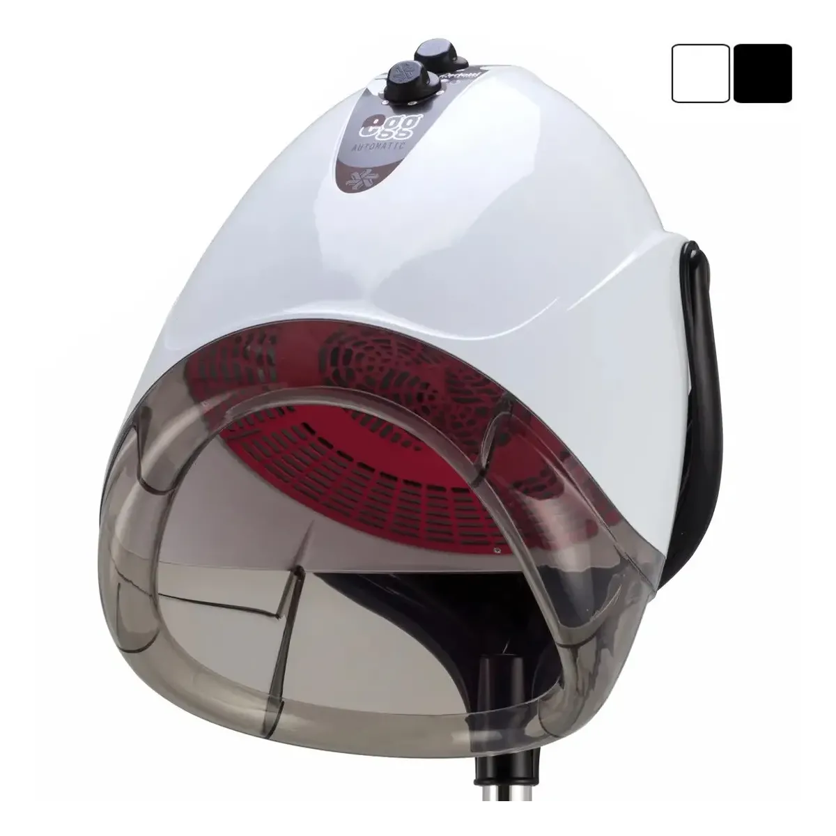 La struttura chiusa ed ergonomica con visiera trasparente, disponibile in bianco o nero, dona un tocco di modernità a ogni postazione di lavoro. Compatibile con stativo a ruote o braccio a parete, è perfetto per parrucchieri che desiderano efficienza e qualità Made in Italy in ogni trattamento.