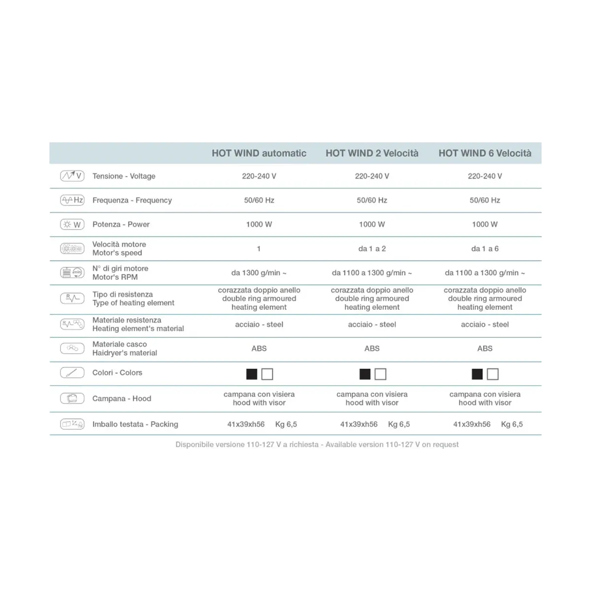 Casco Capelli della nota azienda Ceriotti famosa per la qualità delle sue attrezzature. Hot Wind ha un motore 100% italiano di lunga durata e resistenza tropicale, rappresenta una soluzione professionale di alto livello per parrucchieri ed estetisti che cercano un asciugatore potente, versatile e salvaspazio.