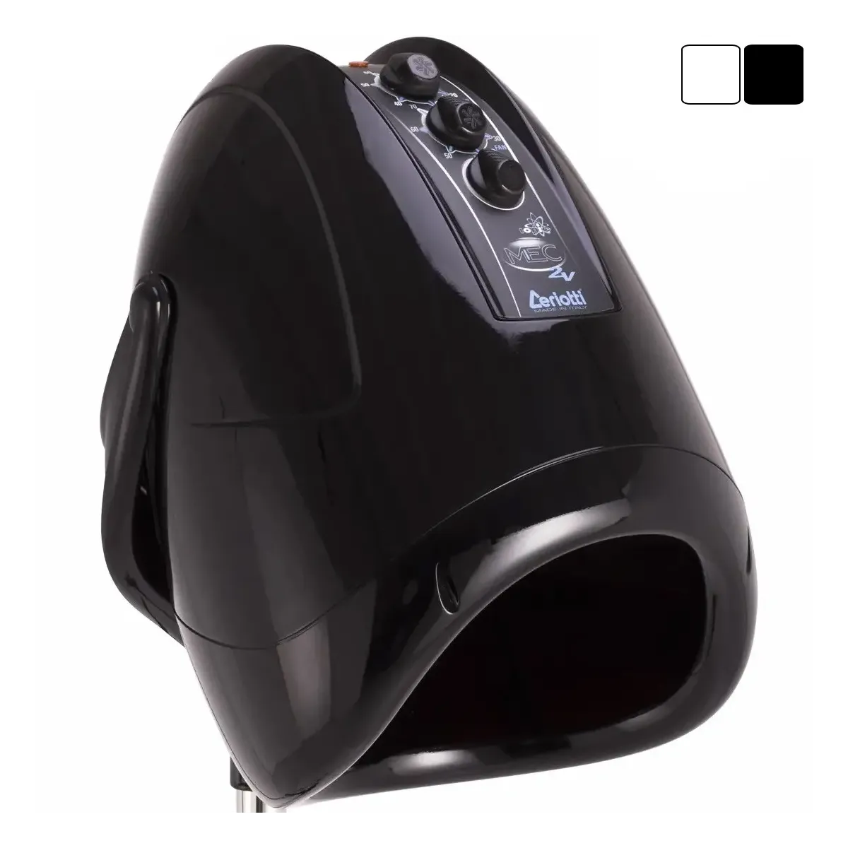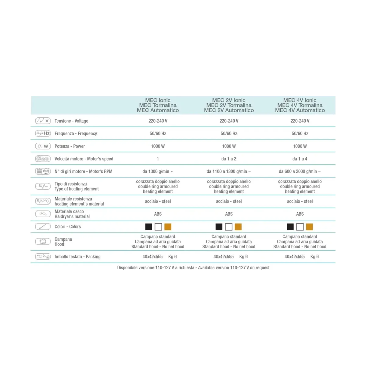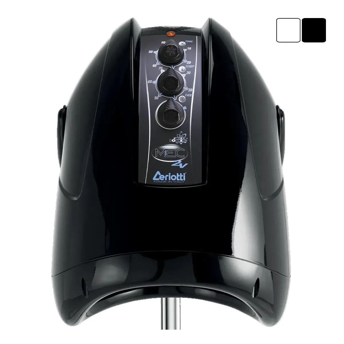 Casco per Parrucchieri Ceriotti Mec, con design compatto che mantiene tutti i confort di un casco tradizionale migliorandone le prestazioni grazie alla speciale campana, alla portata ed al sistema di flussi interno, permette di ottenere prestazioni ai vertici della categoria. Questo casco asciugacapelli ha anche un'innovativa funzionalità: la Ion Tecnology, questa genera ioni (particelle) con una carica elettrica il cui scopo è quello di evitare l’effetto crespo, la combinazione casco - ionizzatore rompe le molecole d’acqua facilitando l’assorbimento delle stesse nel capello riducendo così i tempi di asciugatura, con benefici diretti anche sulla salute della cute. Altre funzioni presenti sono: temporizzatore, termostato e spia di controllo della temperatura. Di seguito mostriamo come impostare le varie programmazioni di lavoro e temperatura e selettore di velocità.