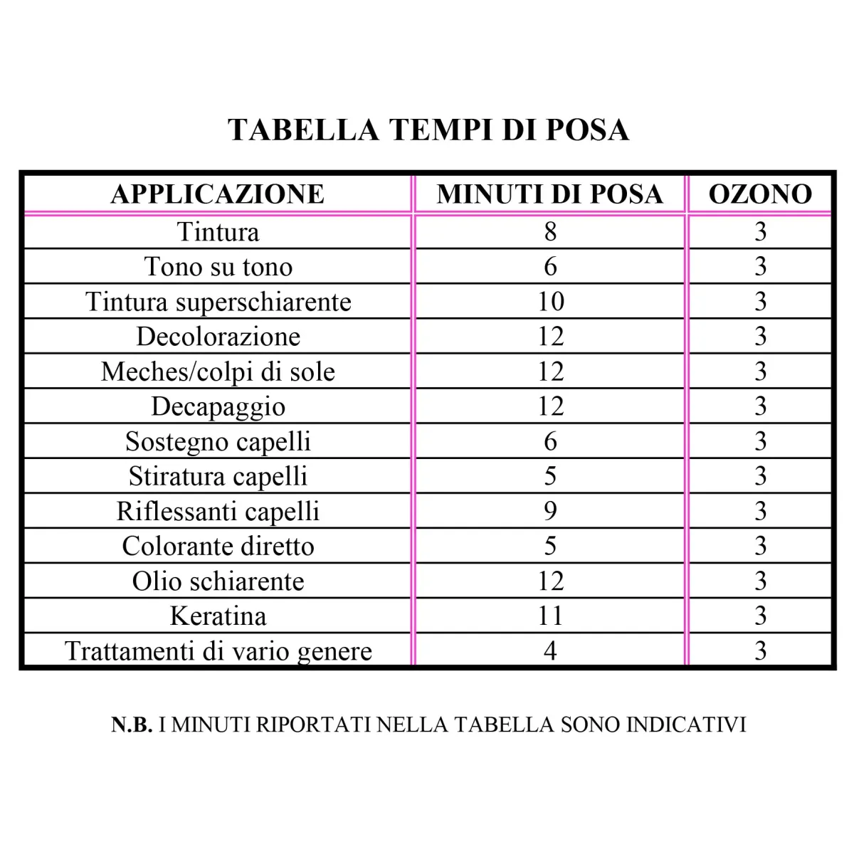 Ovviamente i minuti sono indicativi perché il professionista deve sempre visionare il trattamento, inoltre in tabella ci sono altri 3 minuti aggiuntivi che sono da aggiungere nel caso acquisterai un vaporizzatore capelli con ozono che dona ai capelli altri benefici specifici, puoi trovarlo cliccando qui.