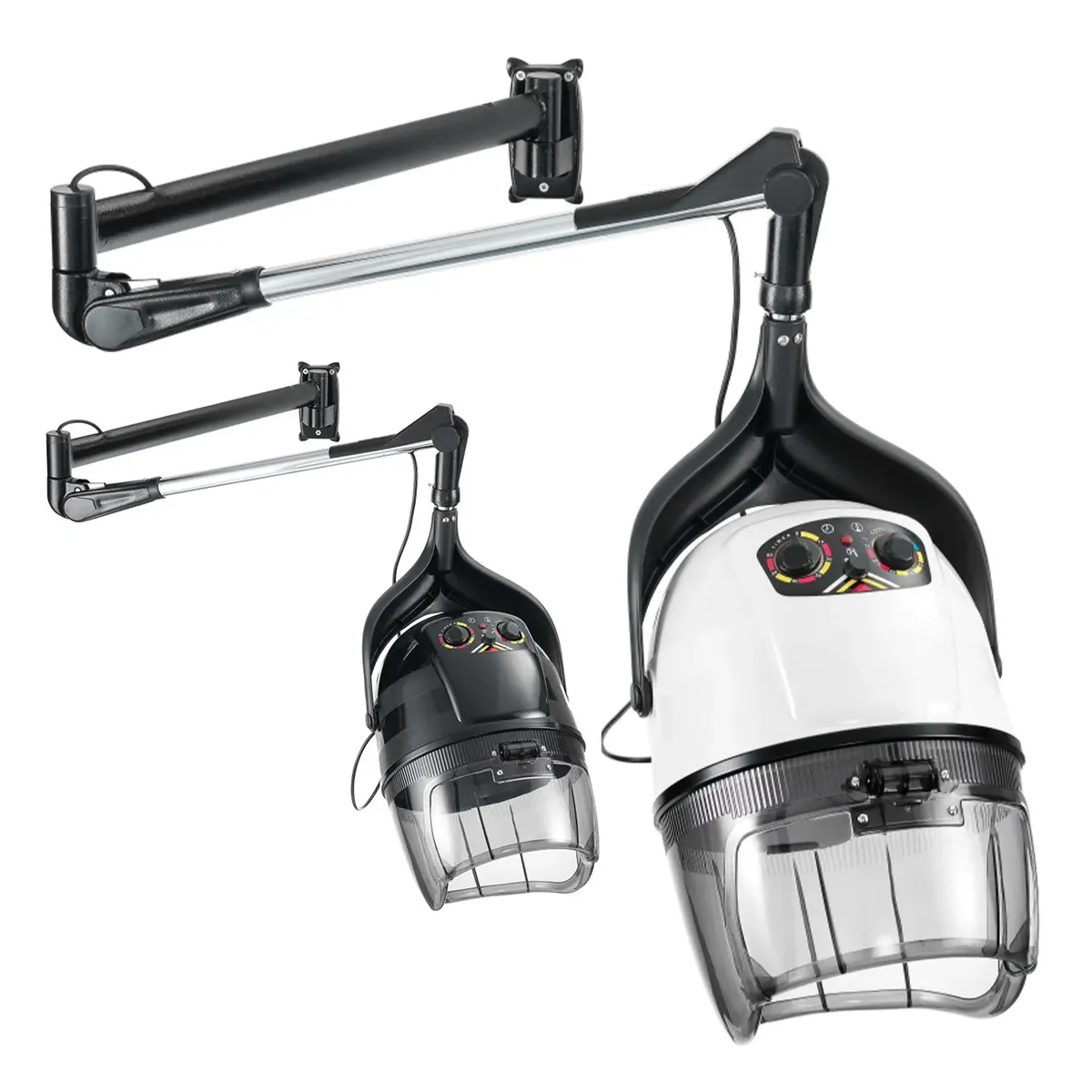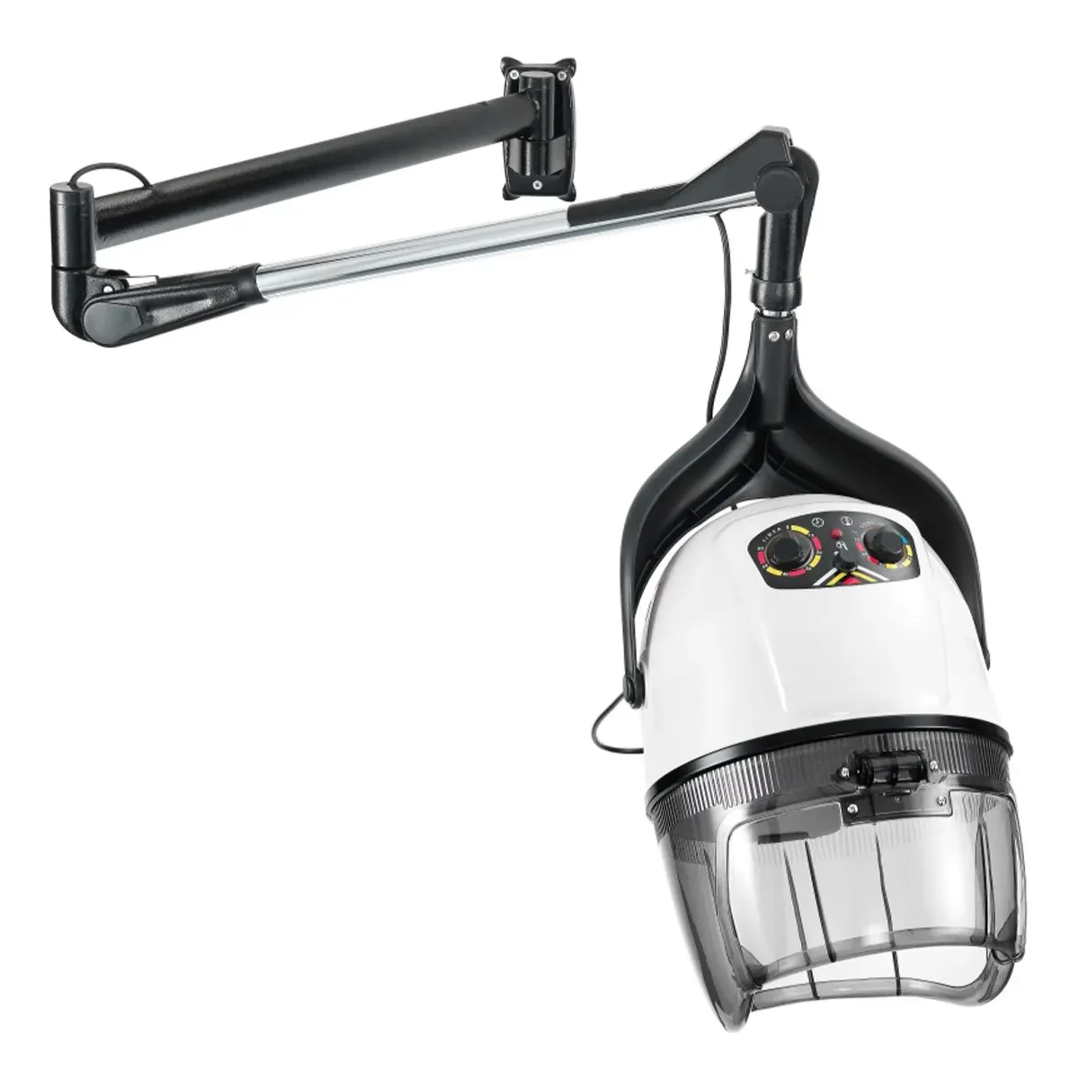Casco Asciugacapelli Professionale dal design innovativo con possibilità di scelta in due soluzioni di montaggio: con stativo oppure con braccio a muro; inoltre è possibile anche scegliere il colore della campana tra bianco e nero. Il casco capelli possiede frontalmente una visiera apribile per facilitare l'ingresso della testa e sopra di esso un pannello comandi molto semplice da utilizzare siccome comprende 3 manopole che vanno a regolare il timer che è da 60 minuti, la temperatura con una massima di 60°C ed il selettore di velocità delle ventole che varia da 1 a 3. Nel complesso il casco è molto potente siccome assorbe una potenza di 1200 Watt e asciuga rapidamente i capelli riducendo i tempi in salone senza andare a danneggiare i capelli delle vostre clienti.