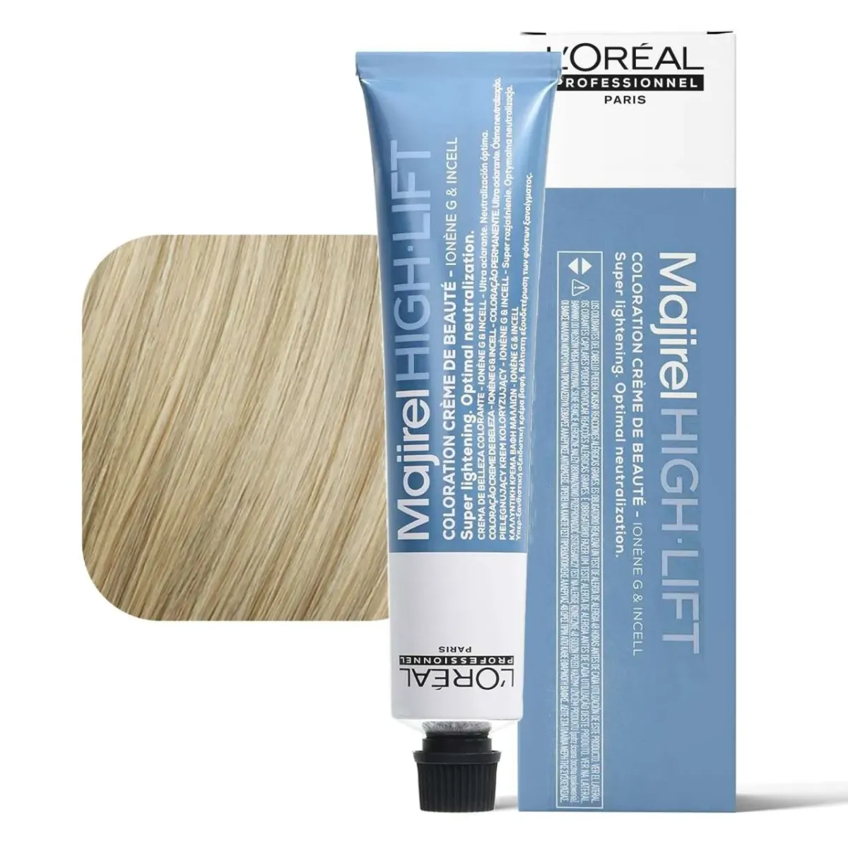 Majirel High Lift L'oreal: una colorazione permanente che, attraverso una miscela di agenti alcalini e ossidanti rivela il colore nella profondità della fibra capillare donando luce ai pigmenti naturali. Offre diverse gradazioni di biondo ghiaccio che si adattano a qualsiasi esigenza. La formula con Ionène G e Incell dona ai capelli morbidezza e rinforza l'intera fibra capillare. Può coprire fino al 30% dei capelli bianchi sparsi e rari.