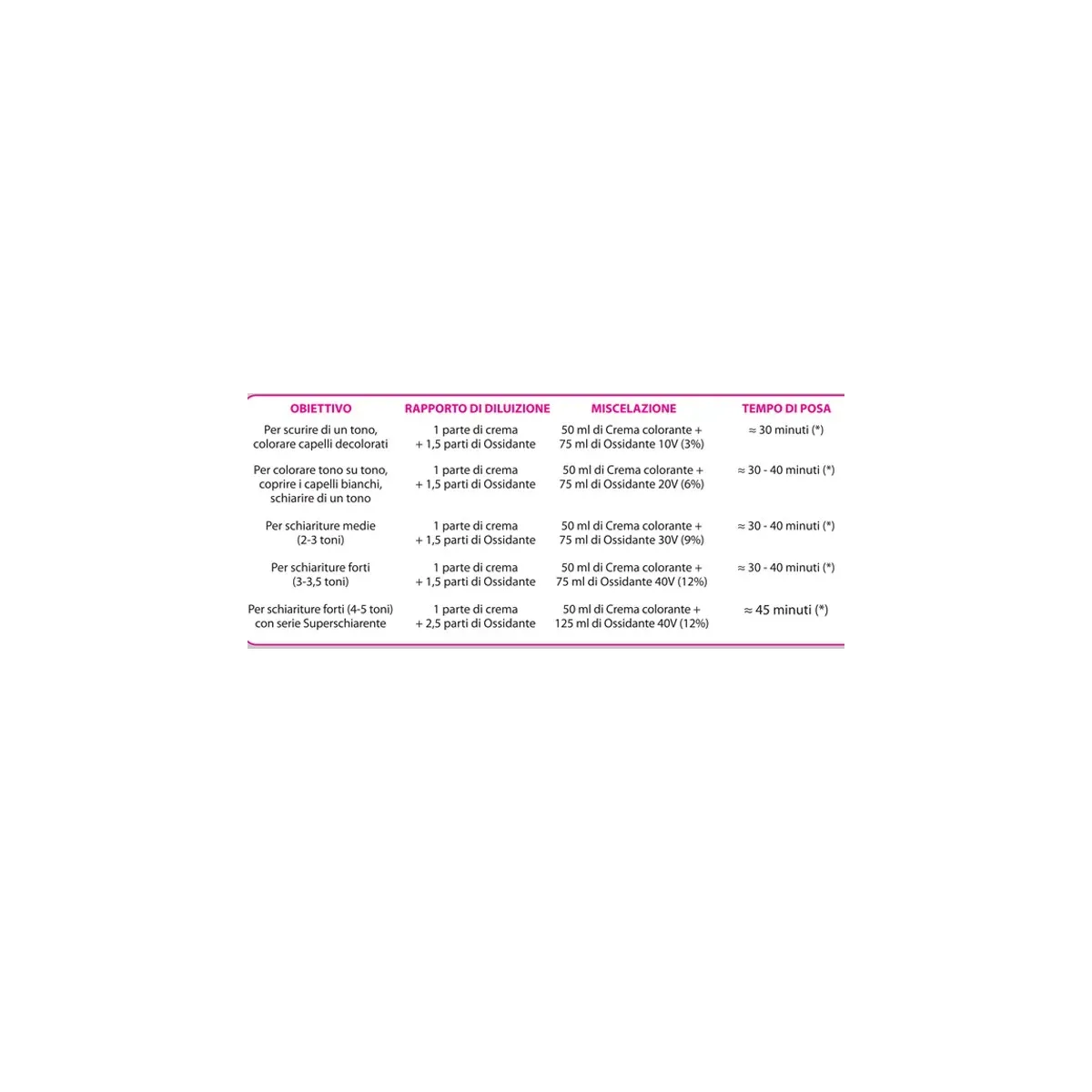 4. Il livello di schiaritura può arrivare fino a 1/2 tono (es. 50% di #7 + 50% di neutro + 1.5 parti di ossidante = nuance #7 e 1/2) .