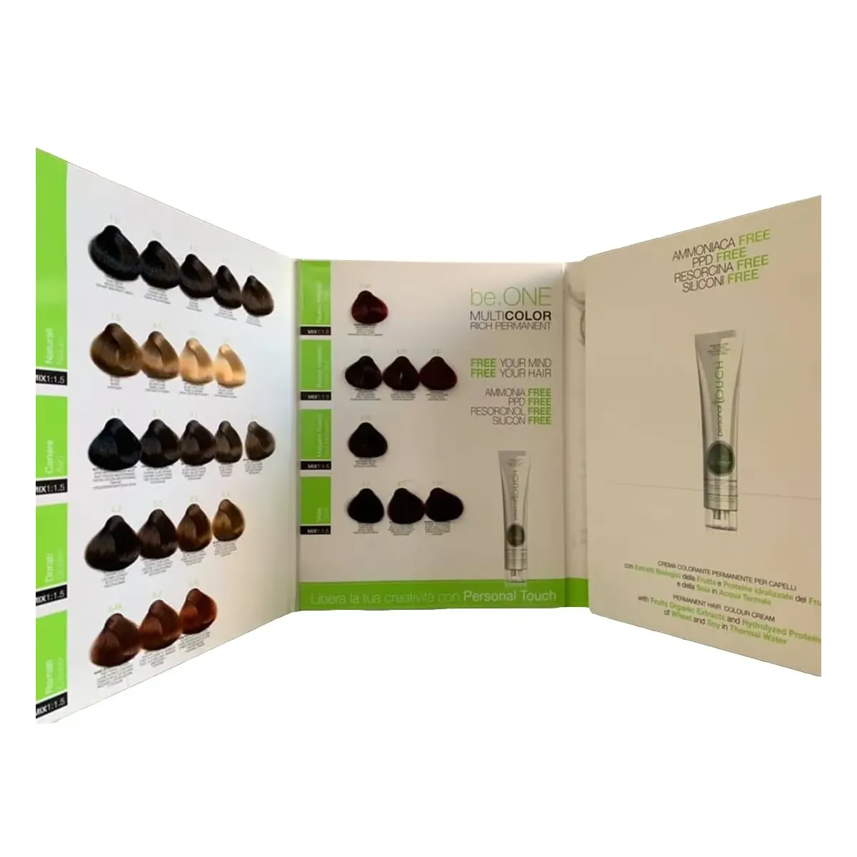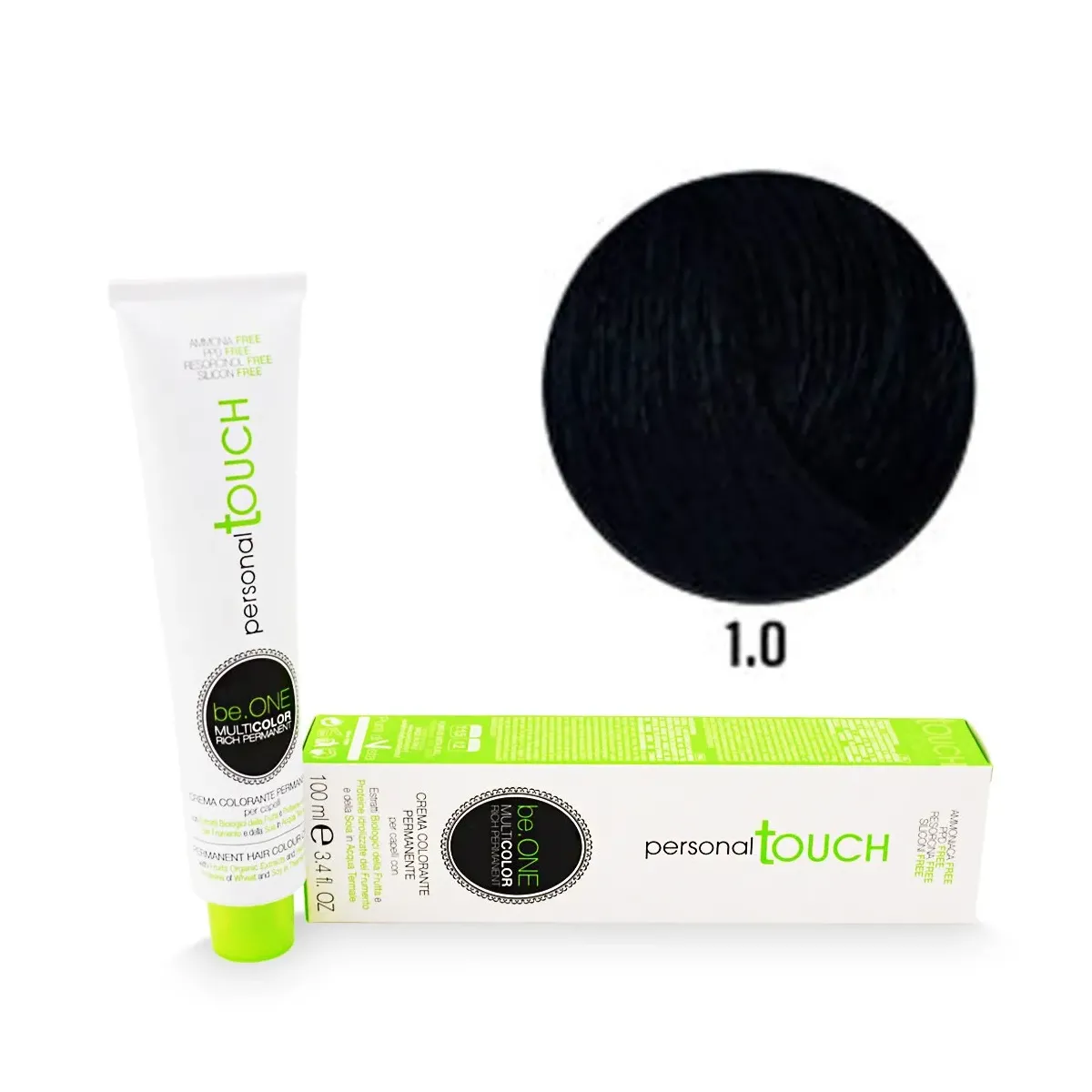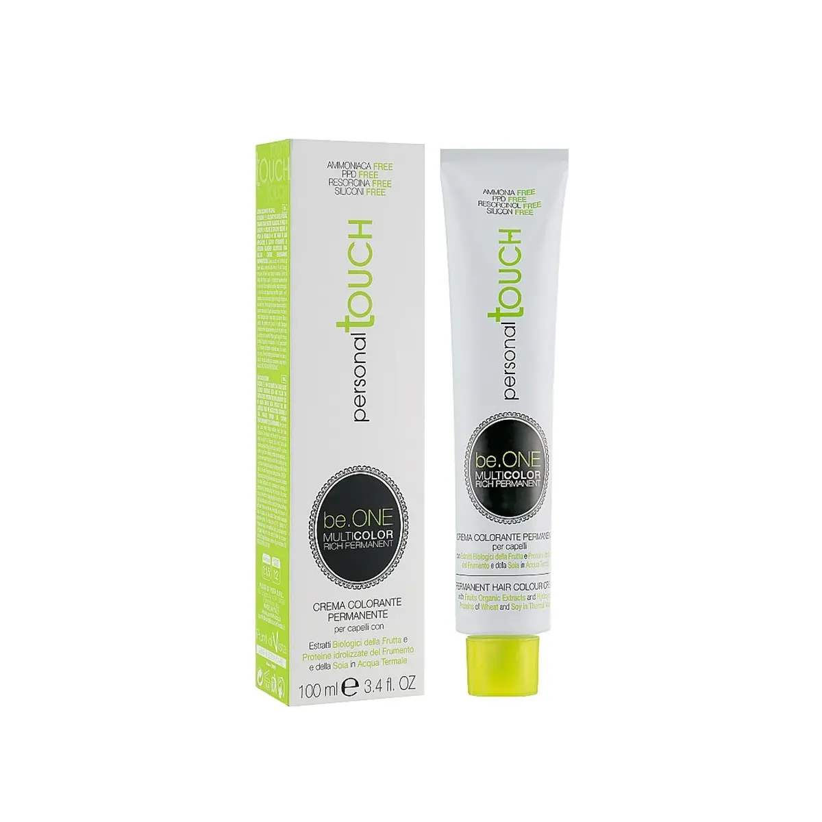 be.One MULTICOLOR RICH PERMANENT di PERSONAL TOUCH è l'innovativo sistema di colorazione permanente per capelli, con estratti biologici della frutta e proteine idrolizzate del frumento e della soia, miscelate in acqua termale. La sua formulazione di origine vegetale non contiene ammoniaca, ppd, resorcina e siliconi, quindi, oltre a favorire una più efficace penetrazione del pigmento colorante e ad assicurare una colorazione uniforme, luminosa e duratura nel tempo, rispetta il cuoio capelluto e la fibra capillare. Per una colorazione all'avanguardia, di origine vegetale, che si prende cura dei capelli e garantisce la totale copertura dei capelli bianchi, che risultano straordinariamente brillanti, morbidi, idratati e protetti. La texture morbida e cremosa di be.One MULTICOLOR RICH PERMANENT di PERSONAL TOUCH si miscela perfettamente con lo SWEET ACTIVATOR di PERSONAL TOUCH, arricchito di estratti vegetali, per una più pratica ed efficace adesione della miscela colorante al capello durante l'applicazione, che si trasforma in un soffice e delicato abbraccio per l'intera capigliatura. Istruzioni per la preparazione: il rapporto di miscelazione è di 1:1.5, per esempio miscelare 50 ml di be.One MULTICOLOR RICH PERMANENT di PERSONAL TOUCH con 75 ml di SWEET ACTIVATOR di PERSONAL TOUCH in una ciotola non metallica. Per la serie dei superschiarenti, il rapporto di miscelazione è di 1:2 (50 ml di be.One MULTICOLOR RICH PERMANENT di PERSONAL TOUCH con 100 ml di SWEET ACTIVATOR di PERSONAL TOUCH). Applicazione: distribuire uniformemente la miscela ottenuta sui capelli asciutti non lavati, immediatamente dopo la preparazione. Risciacquo: terminato il tempo di posa, emulsionare accuratamente, risciacquare abbondantemente i capelli fino a quando l'acqua non diventa limpida ed effettuare uno shampoo con un prodotto a pH acido. per Tinta senza Ammoniaca Be.One Professional