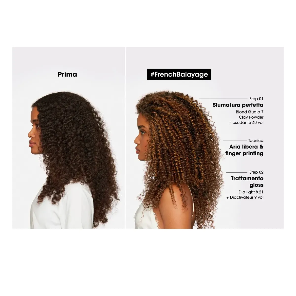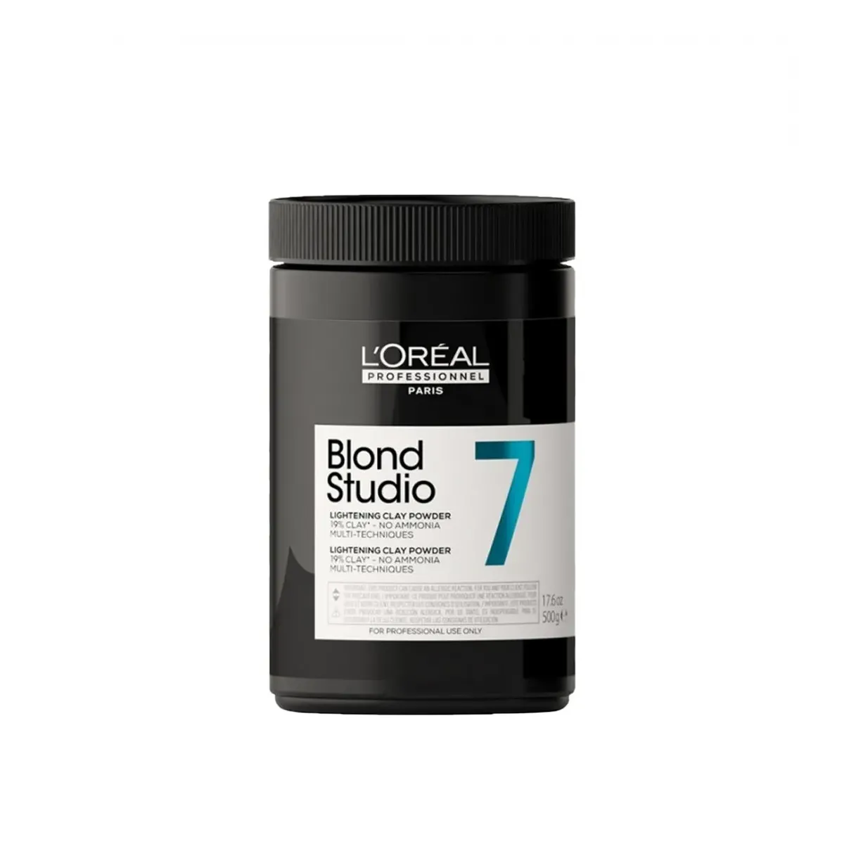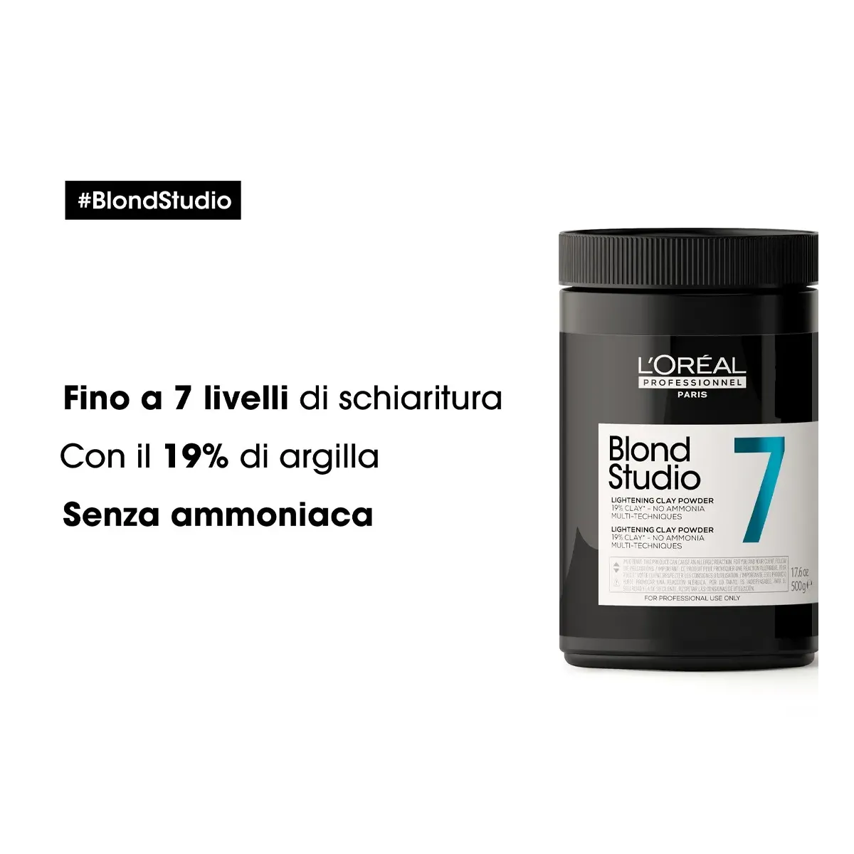 L'Oreal Blond Studio 7 Polvere schiarente multitecnica senza ammoniaca fino a 7 livelli di schiaritura. Formula con il 19% di argilla per una texture elastica ideale per balayage a mano libera.