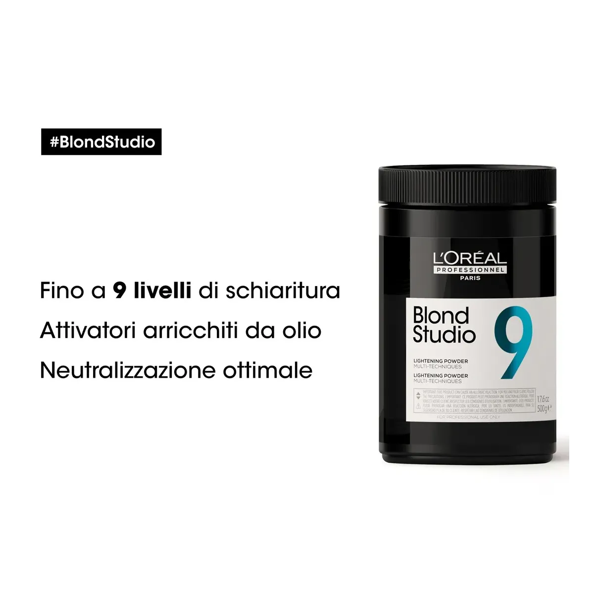 Polvere schiarente multitecnica L'oreal Blond Studio 9 con i suoi esclusivi attivatori arricchiti da olio. Fino a 9 livelli di schiaritura. Texture cremosa, ideale per qualsiasi balayage o servizio di schiaritura.