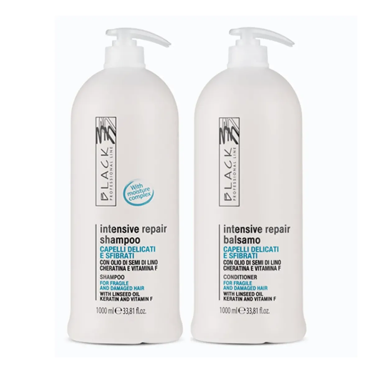 Shampoo e Balsamo Professionali per capelli secchi Black Professional, in comodi formati da 1000 ml.