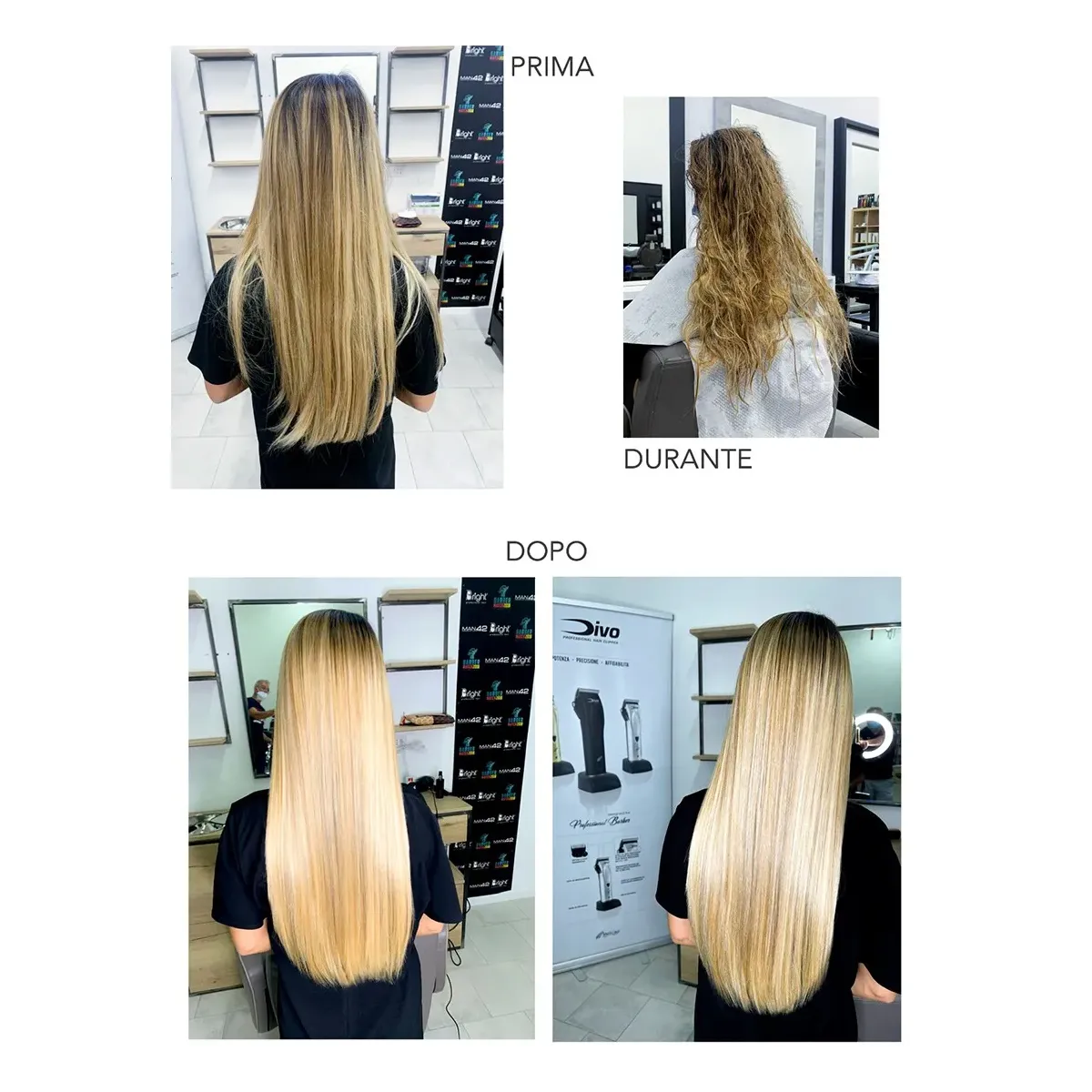 - Procedere all’asciugatura con spazzola e phon ed infine utilizzare la piastra su tutta la capigliatura per concludere il trattamento, al termine della procedura i capelli avranno un bellissimo effetto luminoso a tal punto da ricordare il riflesso di uno specchio.