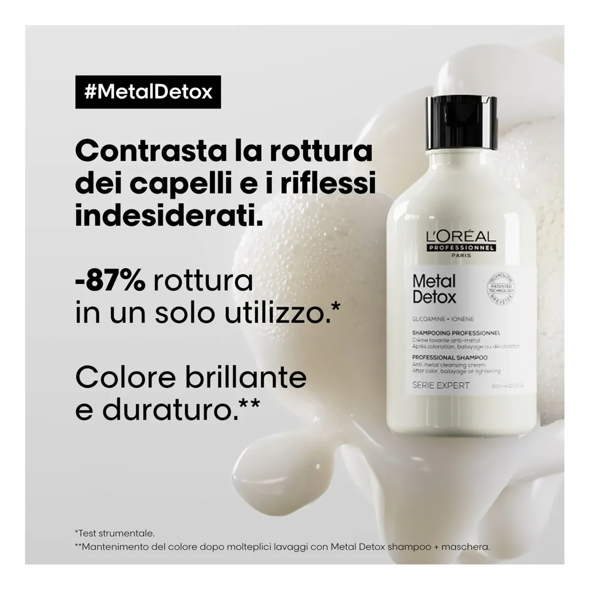 Shampoo L'Oreal Shampoo Metal Detox crema detergente anti-metallo per rimuovere delicatamente le particelle metalliche dai capelli. Una tecnologia brevettata, arricchita con Glicoammina, la molecola che traccia e neutralizza il metallo all'interno della fibra.