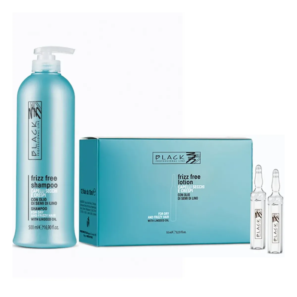 Kit Shampoo Anti Crespo e 12 Fiale ai Semi di Lino Black Professional