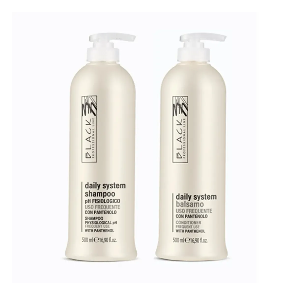 Shampoo e Balsamo per Lavaggi Frequenti Black Professional, in comodi formati da 500 ml.