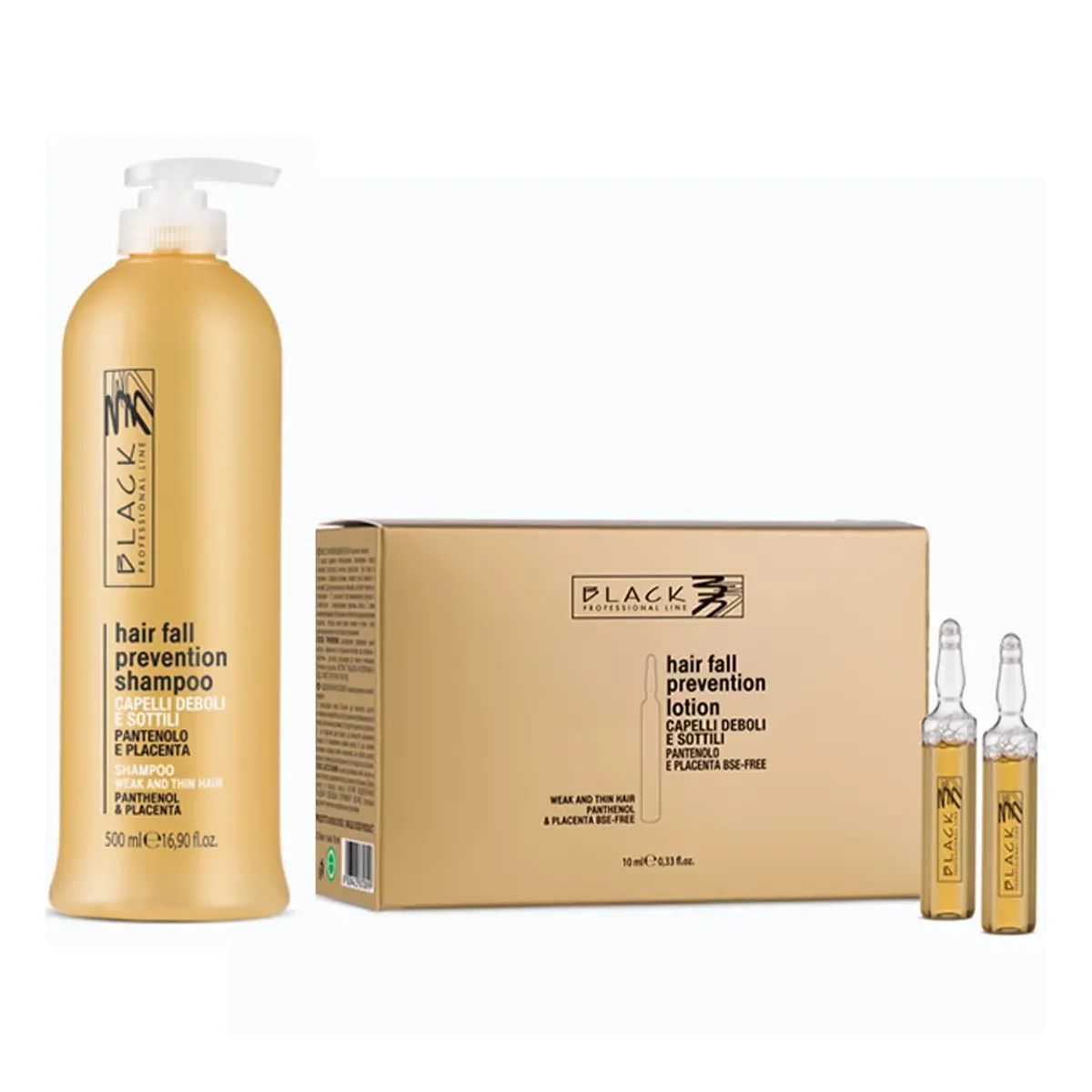 Trattamenti Anticaduta per Capelli Black Professional comprende shampo anticaduta e 12 fiale monodose.