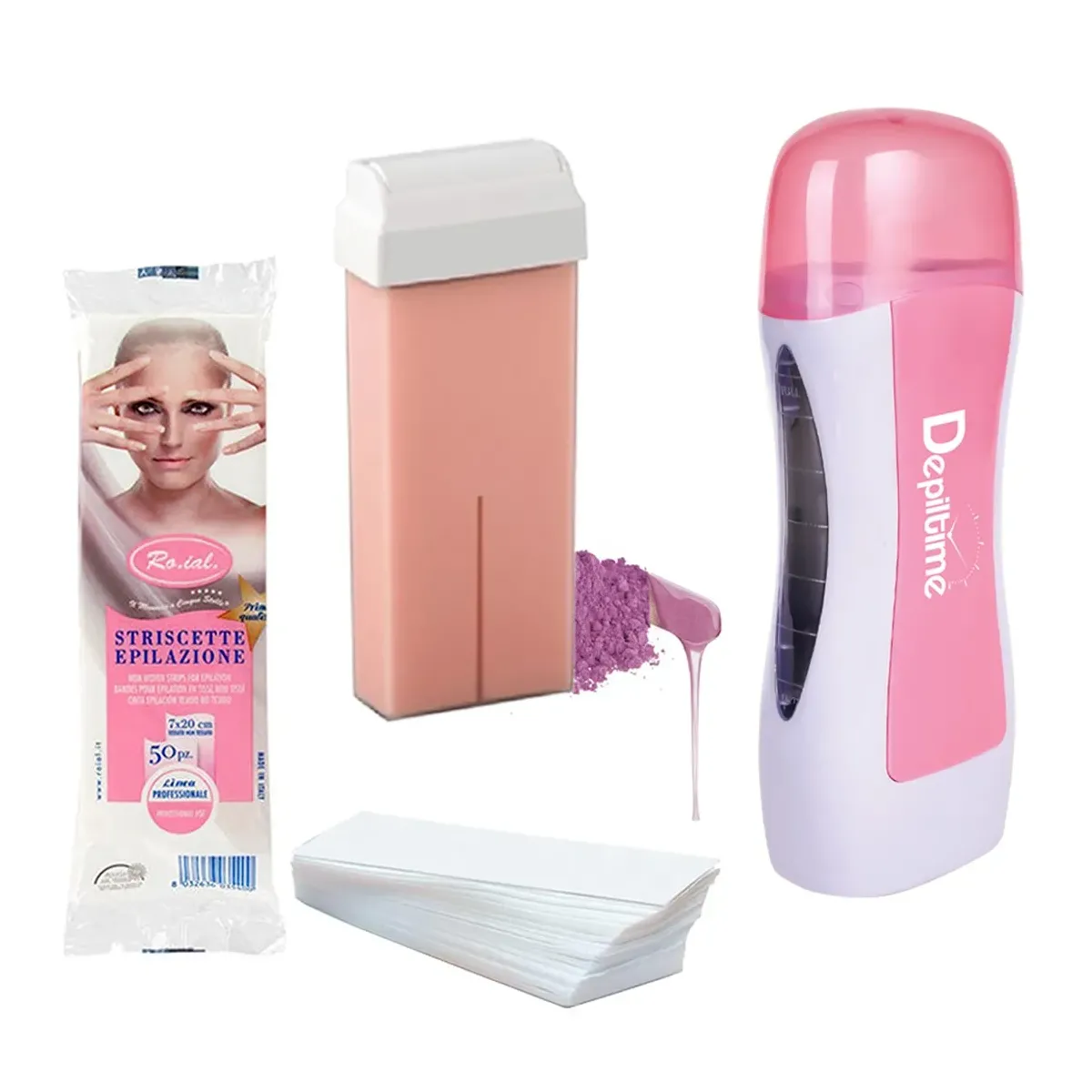 Kit Depilazione completo con scaldacera per effettuare una rapida depilazione. Compresi nel prezzo ci sono uno scaldacera rullo, una cartuccia di cera in titanio rosa e una confezione di strisce depilatorie Roial da 50 pezzi.