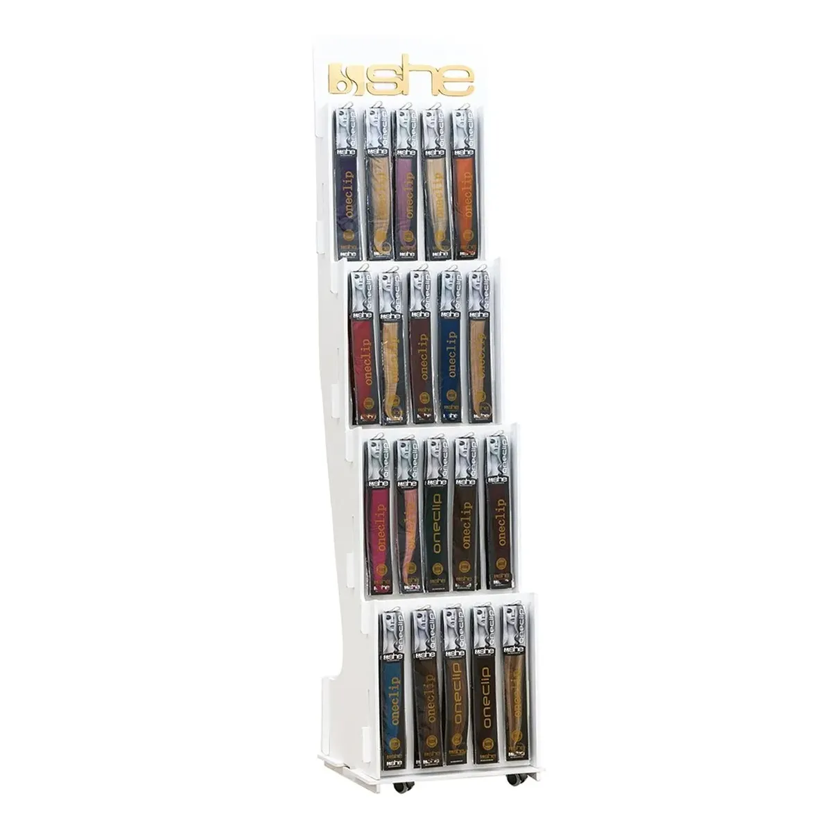 Espositore per Extension specifico per one clip system della She, in modo da esporre ai clienti in modo comodo le ciocche, grazie alle comode rotelle potrai trasportarlo in salone con estrema facilità