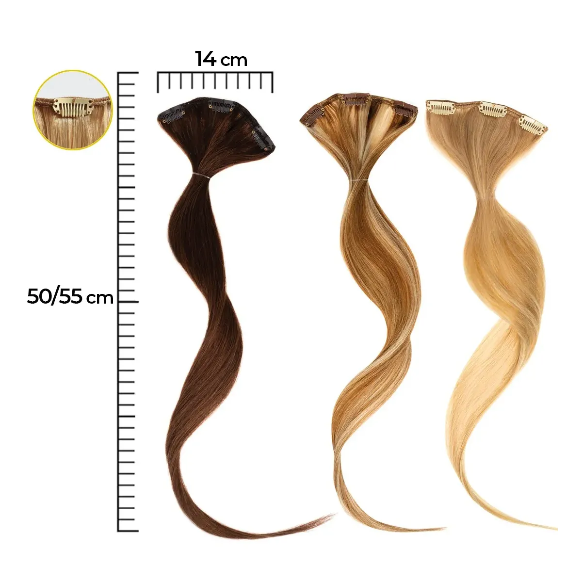 Per ricoprire l'intera chioma con le extension a clip considerando la loro larghezza di 14 centimetri, occorrono come minimo 3 fasce, per teste più grandi invece, 4 fasce dovrebbero essere perfette.