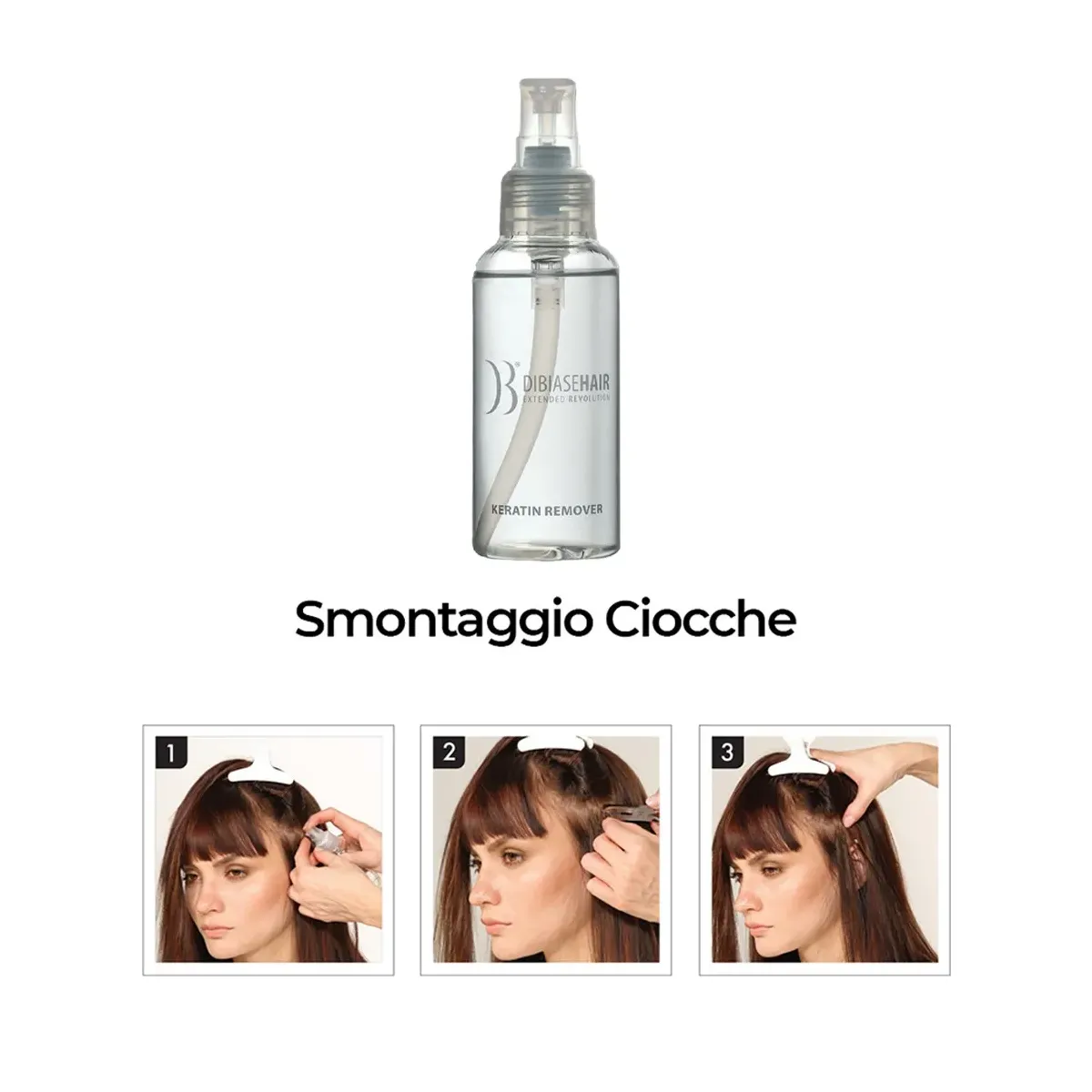 Per rimuovere le extension con cheratina in tutta sicurezza occorre applicare sulla base della ciocca, dov'è presente la cheratina, una goccia di depolimeratore per extension specifico ed altamente professionale, utilizzato dai migliori parrucchieri.