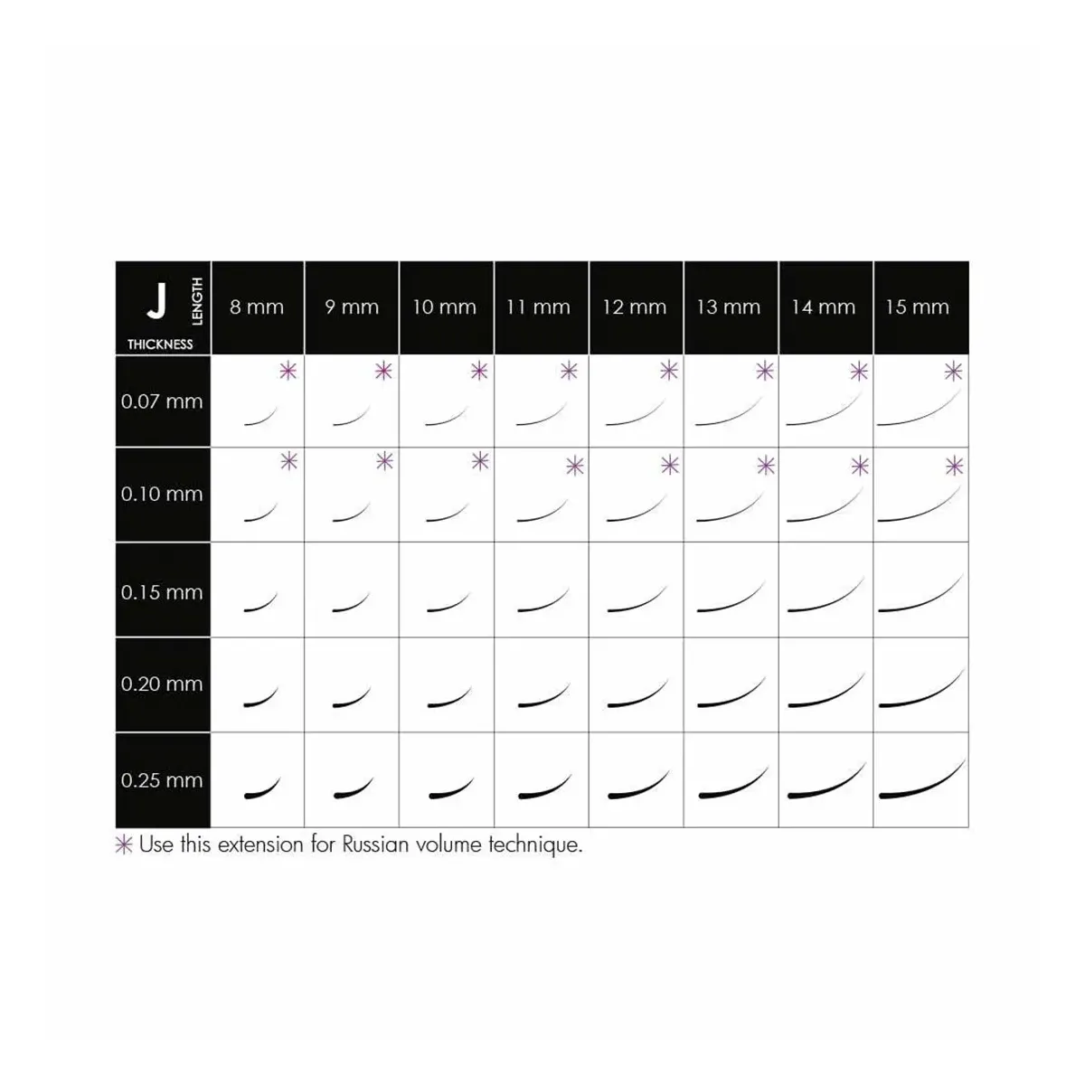 La curva J è la curva più tenue, utilizzata anche per le extension alle ciglia inferiori. È la curva che più assomiglia alla piega naturale delle ciglia, utilizzata per ottenere un effetto naturale. Le singole misure nei vari diametri sono perfette sia per la tecnica classica che per il Russian Volume.