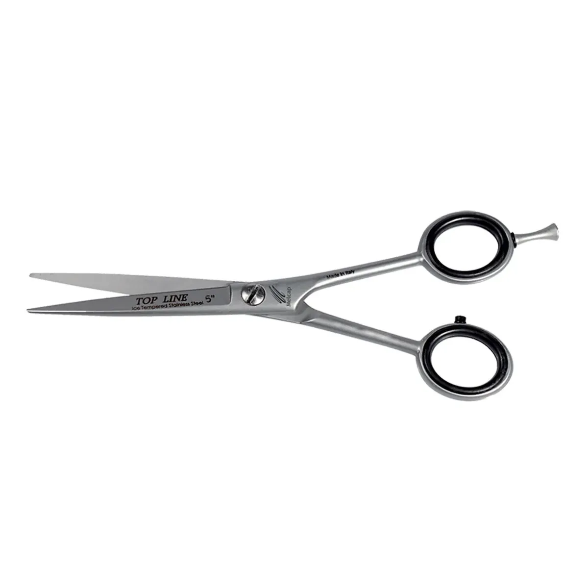 Forbice da Parrucchieri Top line, modello indicato per tutti i tipi di taglio, in particolare tagli scorrevoli. Lama micro-dentata in acciaio inox e misura da 5, 5.5 e 6 pollici.