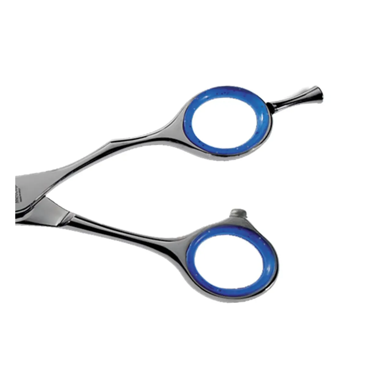 Forbici per Sfoltire da 5,5 pollici, dotate di una lama liscia e l'altra dentata, è indicata per ottenere grandi volumi. Sono fatte in acciaio inox con finitura lucida, hanno una comoda impugnatura grazie agli anelli blu in gomma e sono comprese di supporto riposa dito svitabile.