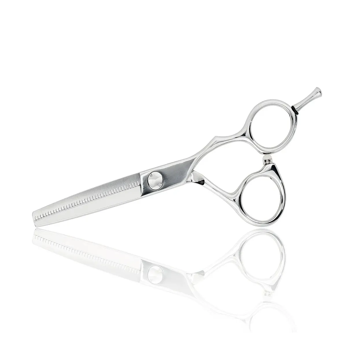 Forbici per Sfoltire da 5'5 pollici, dotate di una lama liscia e l'altra dentata, è indicata per ottenere grandi volumi. Sono fatte in acciaio inox.