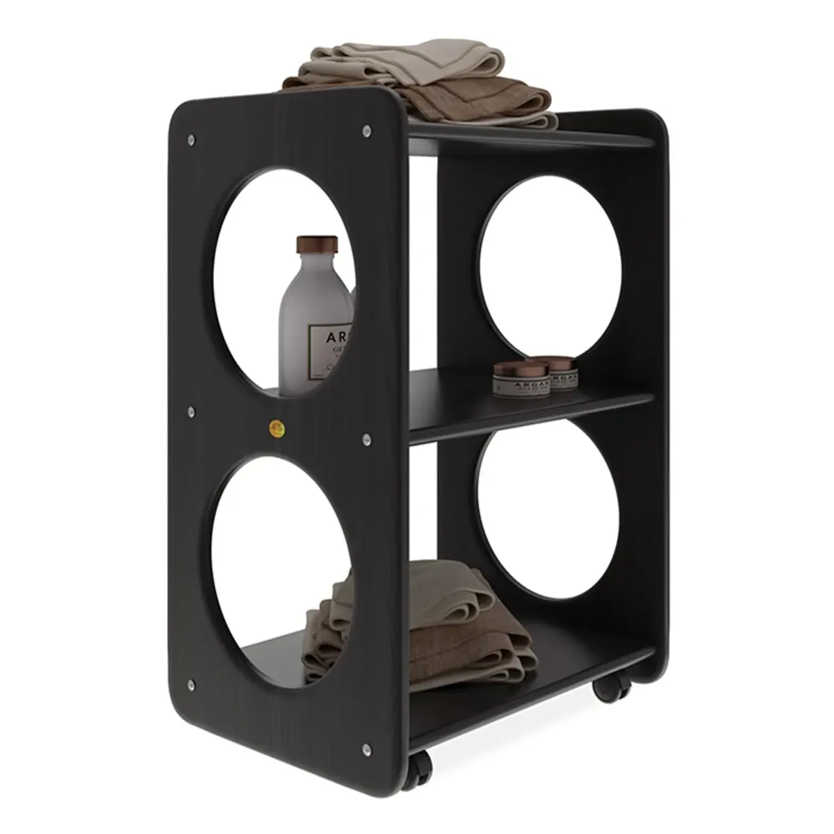 Design Funzionale: Le dimensioni compatte (50x40x77 cm) lo rendono maneggevole e adatto a spazi di lavoro di diverse dimensioni. I ripiani, dotati di aperture circolari, consentono di riporre e organizzare in modo ordinato prodotti di diverse dimensioni, come bottiglie, vasetti e piccoli oggetti. Le ruote lo rendono facilmente spostabile da una postazione all'altra.