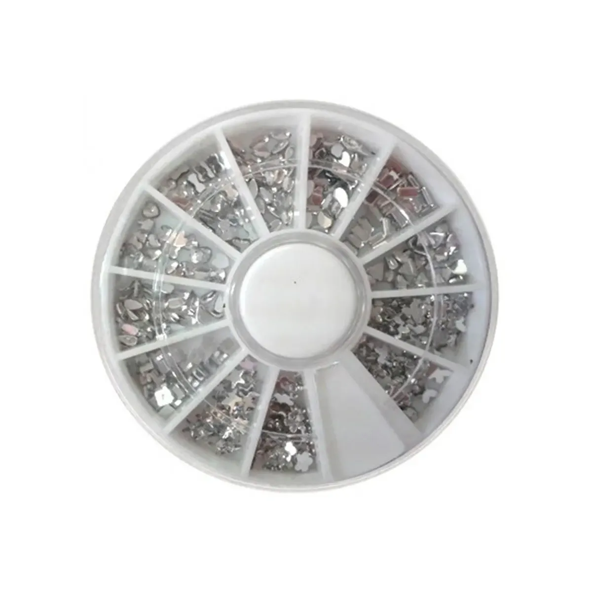 Dai un tocco di brillantezza alla tua nail art con questo pratico Kit di Strass per Unghie! La ruota contiene 12 scomparti pieni di decorazioni in metallo e strass di diverse forme e dimensioni: cuori, stelle, fiori, cerchi e altri motivi originali, ideali per ogni stile.