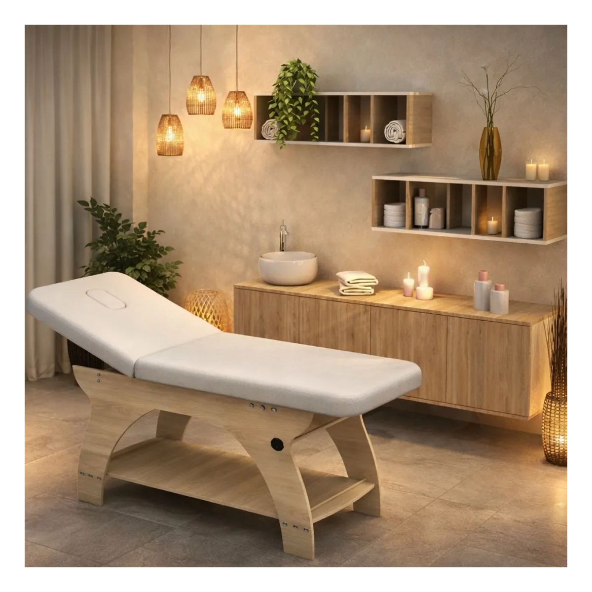 - 1 Lettino massaggio: Lettino estetica fisso con struttura in legno e foro sul pianale per la testa. Testata regolabile fino a 90°. Molto solido e robusto per garantire massima sicurezza. Dimensioni: Altezza max 76 cm, Larghezza 66 cm, Lunghezza 183 cm.