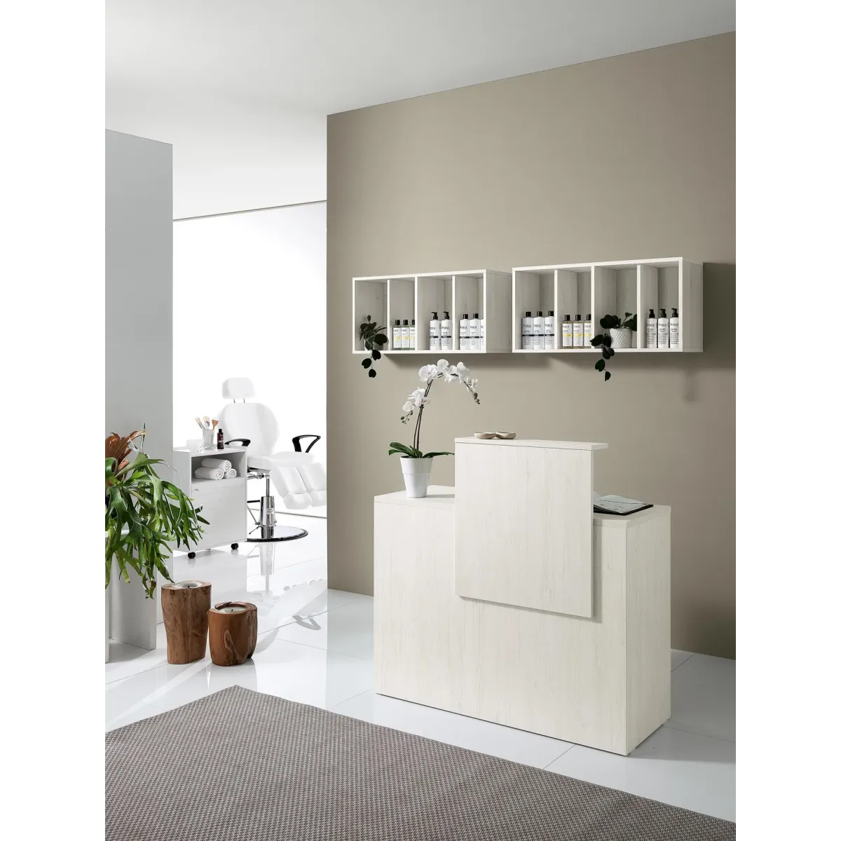 Espositore a Muro con struttura esterna realizzata in legno laminato larice bianco, all'interno sono disponibili 4 vani a giorno. Inoltre è possibile montare l'espositore a parete sia in posizione verticale che orizzontale a seconda del design del vostro centro estetico, in modo da riporre asciugamani, prodotti e attrezzature comodamente.