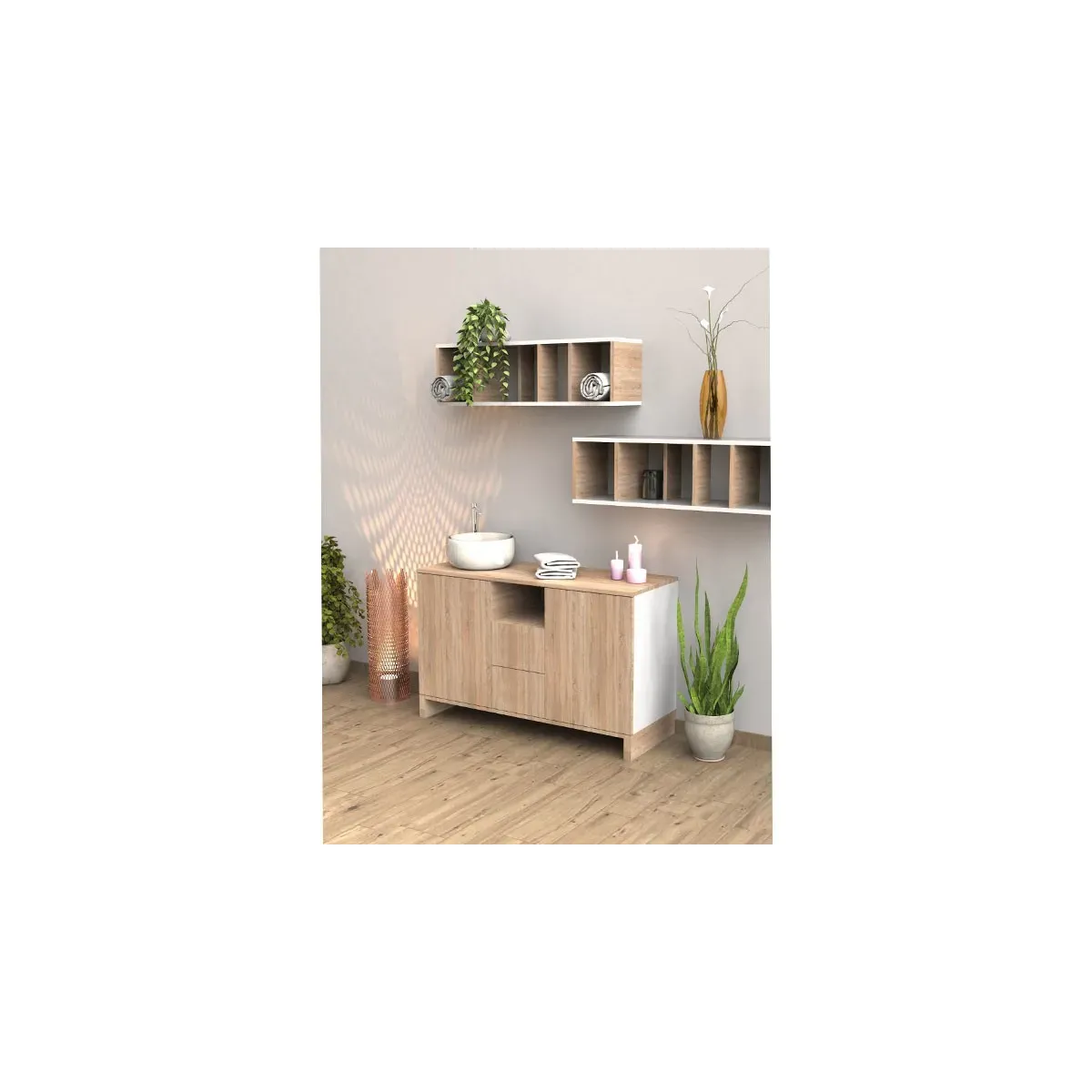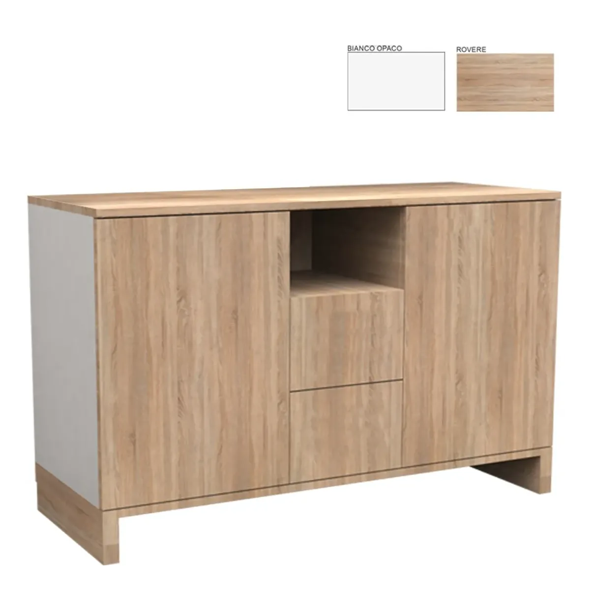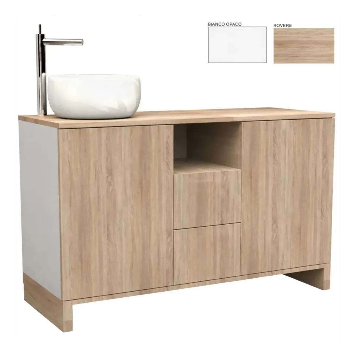 Mobile Centro Estetico strutturato completamente in legno con possibilità di scelta tra i colori bianco opaco e rovere. Può essere acquistato sia completo di accessori come il lavello ed il miscelatore, che senza. Il mobile per centro estetico presenta 2 ante con sistema di apertura premi/apri, 2 cassetti e un vano a giorno.