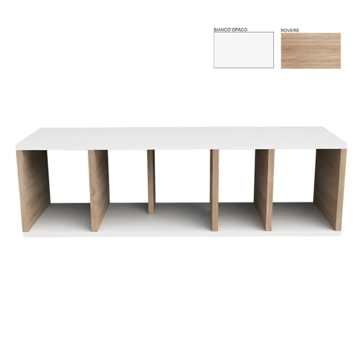 Espositore a parete realizzato in legno rovere e bianco opaco, con mensole separatorie.