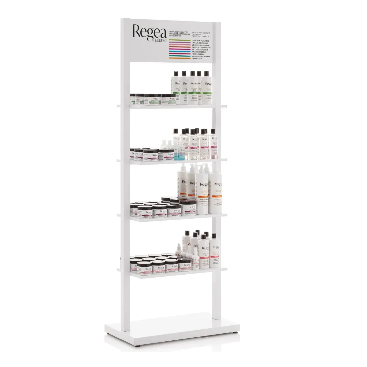 Ripiani Multipli: Dotato di 4 ripiani orizzontali, offre ampio spazio per organizzare ed esporre una vasta gamma di prodotti di diverse dimensioni.