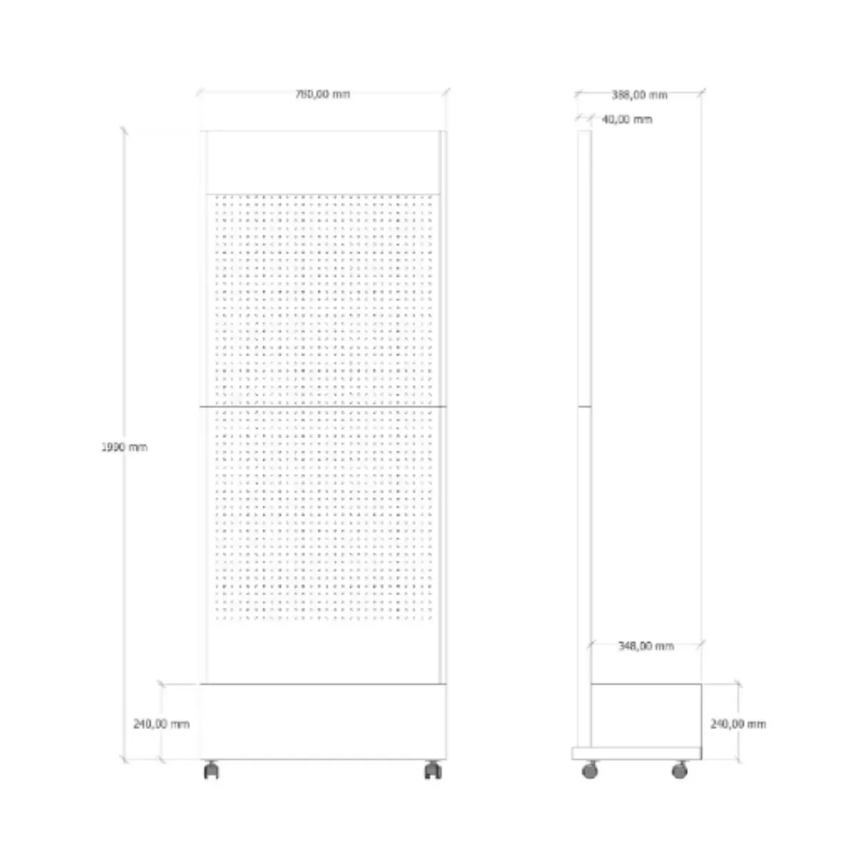 L'espositore è dotato di ganci metallici nella parte superiore, ideali per appendere prodotti confezionati o accessori. La parete centrale forata permette di posizionare i ganci in modo flessibile, adattandosi alle diverse esigenze di esposizione.