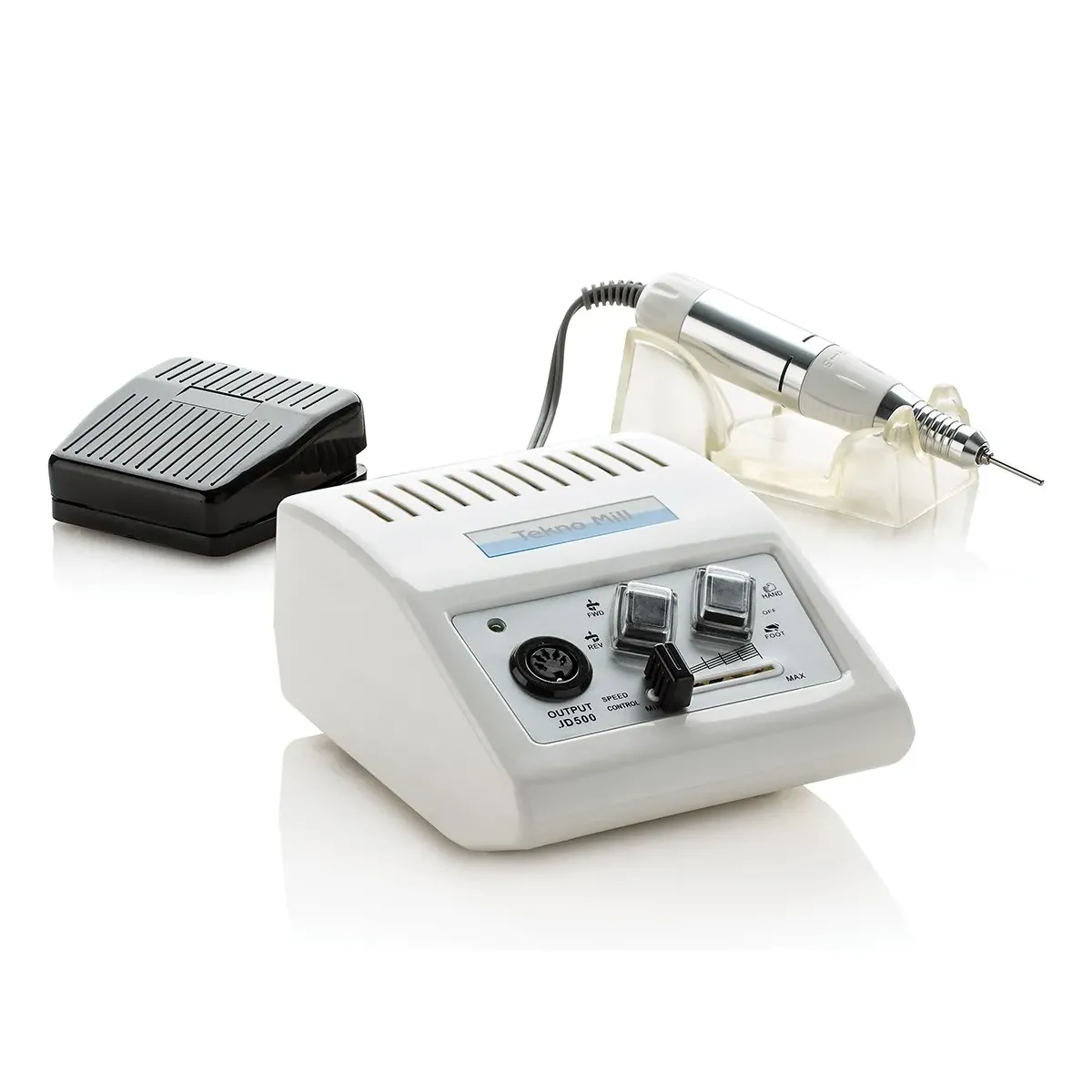 La centralina compatta permette un uso intuitivo e sicuro, con pulsanti dedicati per tutte le funzioni. La fresa include anche un pratico supporto per il manipolo e uno stile professionale e minimalista.