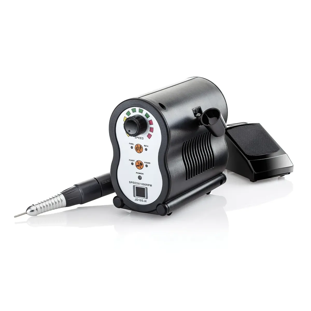 Fresa unghie silenziosa professionale da 20 Watt. Velocità regolabile fino a 35.000 Rpm. Possibilità di scegliere il verso della rotazione. Accessoriata con una serie di frese di prima qualità e pedale per la regolazione dei giri.